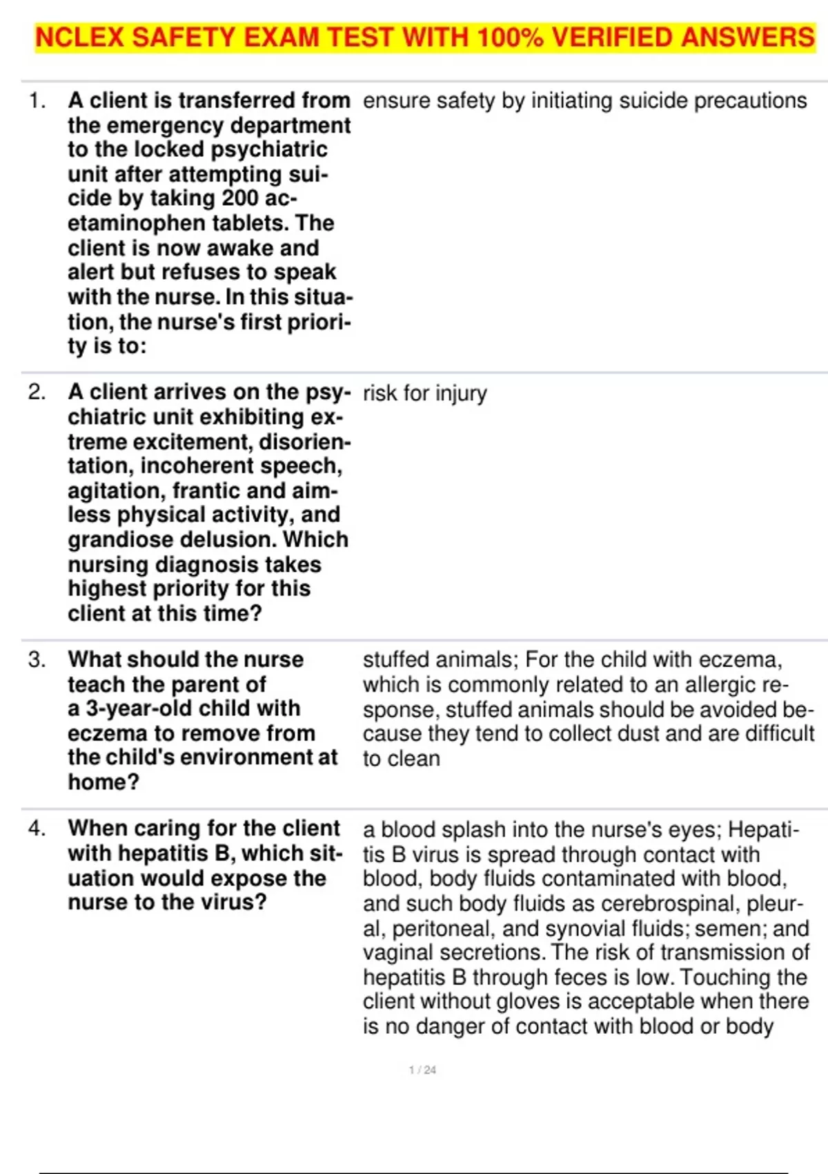 NCLEX SAFETY EXAM TEST WITH 100% VERIFIED ANSWERS 1. A client is transferred from the emergency department to the locked psychiatric unit after attempting sui- cide by taking 200 ac- etaminophen tablets. The client is now awake and alert but refuses to speak with the nurse. In this situa- tion, the nurse's first priori- ty is to: 2. A client arrives on the psy- chiatric unit exhibiting ex- treme excitement, disorien- tation, incoherent speech, agitation, frantic and aim- less physical activity, and grandiose delusion. Which nursing diagnosis takes highest priority for this client at this time? 3. What should the nurse teach the parent of a 3-year-old child with eczema to remove from the child's environment at home? 4. When caring for the client with hepatitis B, which sit- uation would expose the nurse to the virus? ensure safety by ini