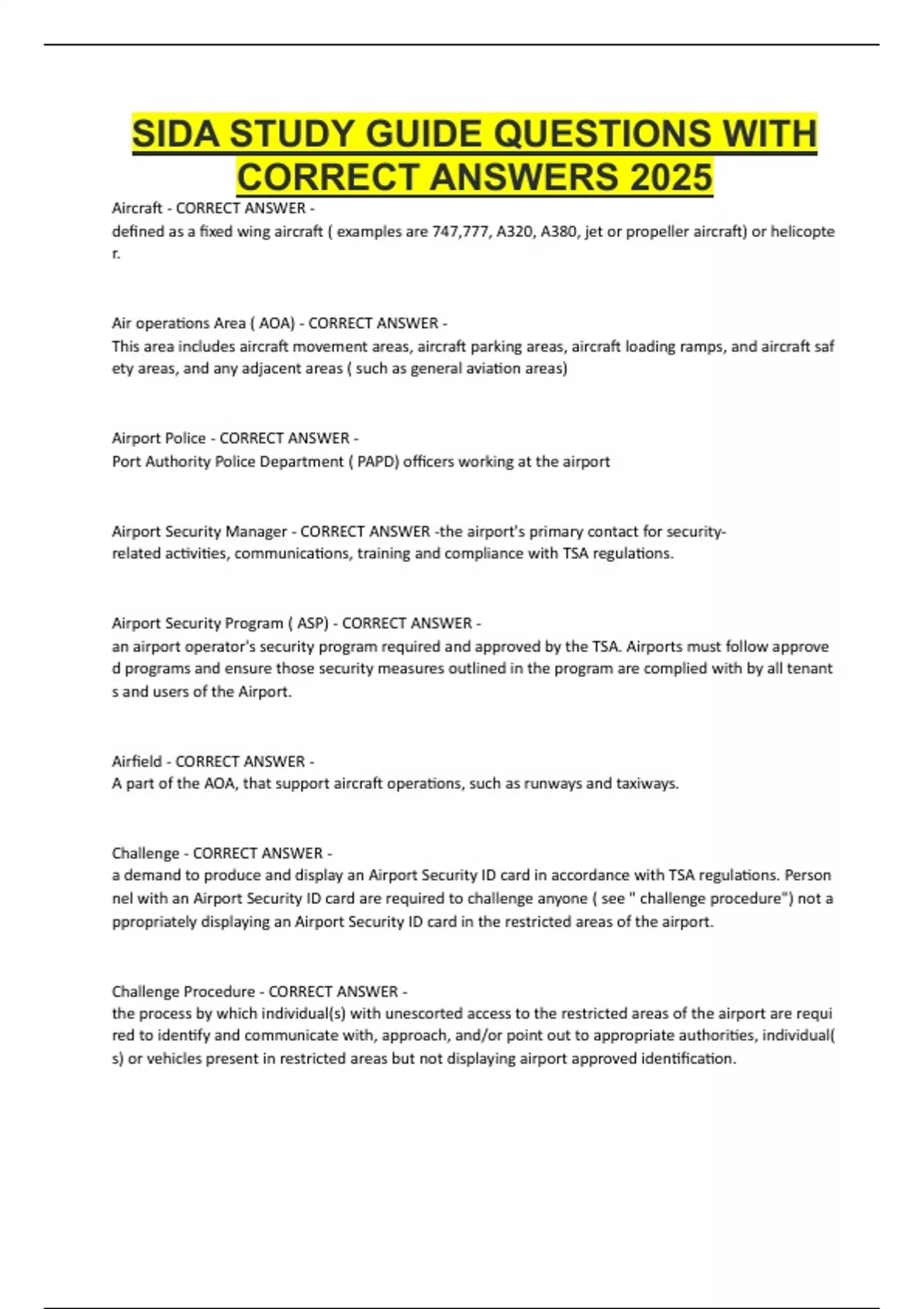 SIDA STUDY GUIDE QUESTIONS WITH CORRECT ANSWERS 2025