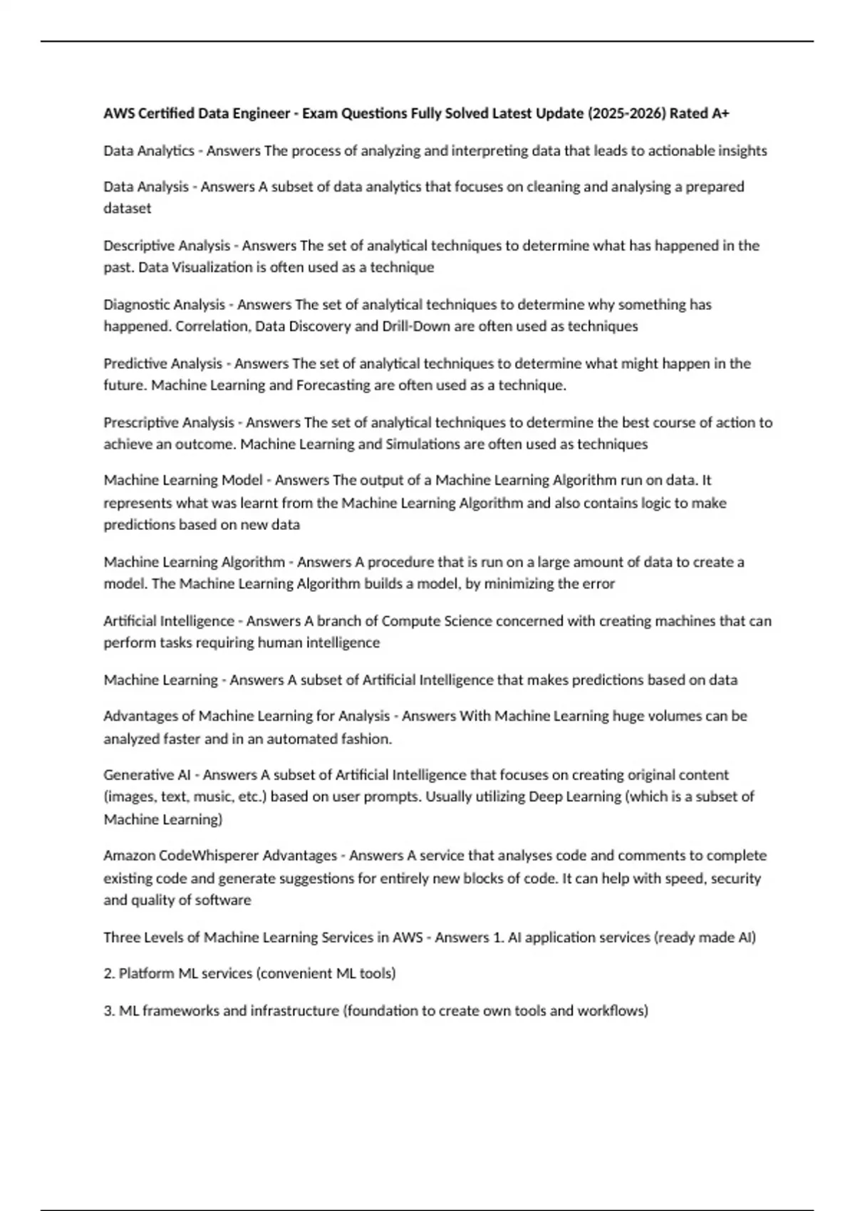AWS Certified Data Engineer - Exam Questions Fully Solved Latest Update () Rated A+ Data Analytics - Answers The process of analyzing and interpreting data that leads to actionable insights Data Analysis - Answers A subset of data analytics that focuses on cleaning and analysing a prepared dataset Descriptive Analysis - Answers The set of analytical techniques to determine what has happened in the past. Data Visualization is often used as a technique Diagnostic Analysis - Answers The set of analytical techniques to determine why something has happened. Correlation, Data Discovery and Drill-Down are often used as techniques Predictive Analysis - Answers The set of analytical techniques to determine what might happen in the future. Machine Learning and Forecasting are often used as a technique. Prescriptive Analysis - Answers The set of analytical techniques to determine the best course of action to achieve an outcome. Machine Learning and Simulations are often used as techniques Machine Learning Model - Answers The output of a Machine Learning Algorithm run on data. It represents what was learnt from the Machine Learning Algorithm and also contains logic to make predictions based on new data Machine Learning Algorithm - Answers A procedure that is run on a large amount of data to create a model. The Machine Learning Algorithm builds a model, by minimizing the error Artificial Intelligence - Answers A branch of Compute Science concerned with creating machines that can perform tasks requiring human intelligence Machine Learning - Answers A subset of Artificial Intelligence that makes predictions based on data Advantages of Machine Learning for Analysis - Answers With Machine Learning huge volumes can be analyzed faster and in an automated fashion. Generative AI - Answers A subset of Artificial Intelligence that focuses on creating original content (images, text, music, etc.) based on user prompts. Usually utilizing Deep Learning (which is a subset of Machine Learning) Amazon CodeWhisperer Advantages - Answers A service that analyses code and comments to complete existing code and generate suggestions for entirely new blocks of code. It can help with speed, security and quality of software Three Levels of Machine Learning Services in AWS - Answers 1. AI application services (ready made AI) 2. Platform ML services (convenient ML tools) 3. ML frameworks and infrastructure (foundation to create own tools and workflows) Big Data - Answers Data that suffers from the 5V's (volume, variety, velocity, veracity, value) Big Data Challenges (5V's) - Answers 1. volume (amount of data) 2. variety (data comes from different types of sources) 3. velocity (speed of data entering) 4. veracity (trustworthiness of data) 5. value (ability to extract insights from data) Challenge of large data volumes (5V's) - Answers It's hard to capture, store, transform and analyze it Three Types of Data (sorted by how easy it is to analyse) - Answers 1. structured - any tabular data with a strict schema 2. semi-structured - Json, XML, etc. 3. unstructured - Images, Text, etc. Cloud Storage for Scalability (sorted from best to worst) - Answers 1. Object Storage 2. Document Storage 3. File Storage Cloud Storage for File Management (sorted from best to worst) - Answers 1. File Storage 2. Object Storage 3. Document Storage Cloud Storage for Metadata Management (sorted from best to worst) - Answers 1. Object Storage 2. File Storage 2. Document Storage Cloud Storage for Performance (sorted from best to worst) - Answers 1. Document Storage 2. File Storage 3. Object Storage