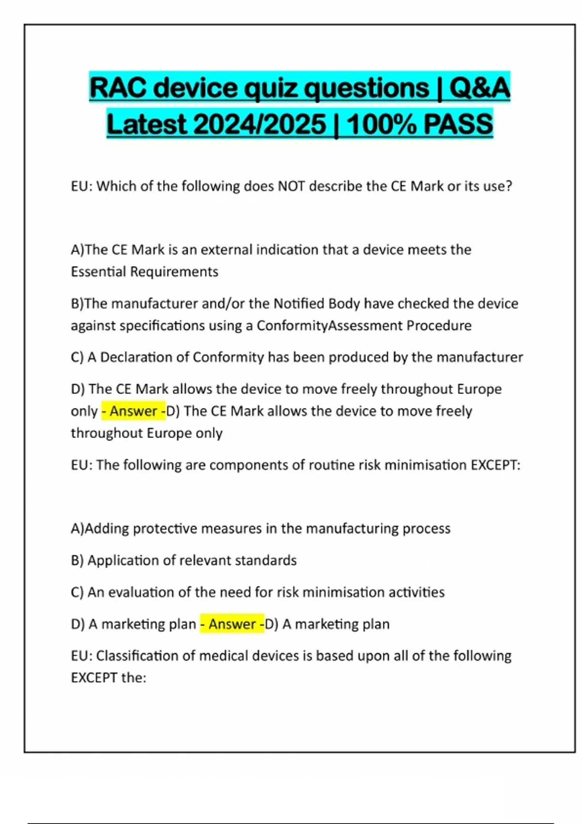 RAC device quiz questions | Q&A Latest 2024/2025 | 100% PASS EU: Which of the following does NOT describe the CE Mark or its use? A)The CE Mark is an external indication that a device meets the Essential Requirements B)The manufacturer and/or the Notified Body have checked the device against specifications using a ConformityAssessment Procedure C) A Declaration of Conformity has been produced by the manufacturer D) The CE Mark allows the device to move freely throughout Europe only - Answer -D) The CE Mark allows the device to move freely throughout Europe only EU: The following are components of routine risk minimisation EXCEPT: A)Adding protective measures in the manufacturing process B) Application of relevant standards C) An evaluation of the need for risk minimisation activities D) A marketing plan - Answer -D) A marketing plan EU: Classification of medical devices is based upon all of the following EXCEPT the:A) Device's intended purpose B) Device's implantability C) Devise invasiveness D) Device's indications for use - Answer -D) Device's indications for use Note: MDR Chapter V Article 51: "Devices shall be divided into classes