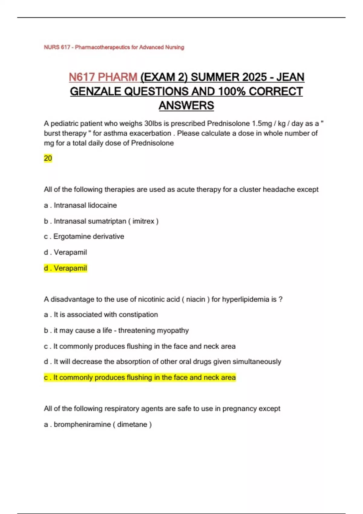 N617 PHARM (EXAM 2) SUMMER 2025 - JEAN