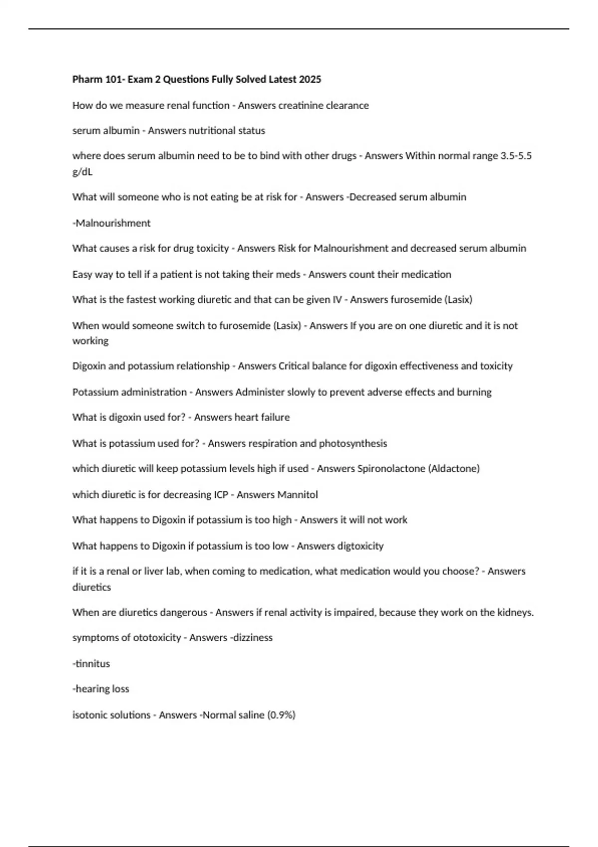Pharm 101- Exam 2 Questions Fully Solved Latest 2025 How do we measure renal function - Answers creatinine clearance serum albumin - Answers nutritional status where does serum albumin need to be to bind with other drugs - Answers Within normal range 3.5-5.5 g/dL What will someone who is not eating be at risk for - Answers -Decreased serum albumin -Malnourishment What causes a risk for drug toxicity - Answers Risk for Malnourishment and decreased serum albumin Easy way to tell if a patient is not taking their meds - Answers count their medication What is the fastest working diuretic and that can be given IV - Answers furosemide (Lasix) When would someone switch to furosemide (Lasix) - Answers If you are on one diuretic and it is not working Digoxin and potassium relationship - Answers Critical balance for digoxin effectiveness and toxicity Potassium administration - Answers Administer slowly to prevent adverse effects and burning What is digoxin used for? - Answers heart failure What is potassium used for? - Answers respiration and photosynthesis which diuretic will keep potassium levels high if used - Answers Spironolactone (Aldactone) which diuretic is for decreasing ICP - Answers Mannitol What happens to Digoxin if potassium is too high - Answers it will not work What happens to Digoxin if potassium is too low - Answers digtoxicity if it is a renal or liver lab, when coming to medication, what medication would you choose? - Answers diuretics When are diuretics dangerous - Answers if renal activity is impaired, because they work on the kidneys. symptoms of ototoxicity - Answers -dizziness -tinnitus -hearing loss isotonic solutions - Answers -Normal saline (0.9%) -Lactated Ringers -D5W Hypotonic solutions - Answers -0.45% NaCl -0.33% NaCl -0.225% NaC -D5W Hypertonic solutions - Answers -3% NaCl -5% NaCl -5% Dextrose When is isotonic solutions given - Answers When someone is dehydrated. (Normal saline) When is hypotonic solutions given - Answers When fluid needs to go into the body (Hippo) When is hypertonic solutions given - Answers When there is too much fluid in the body (Too much salt) Signs of digoxin toxicity - Answers -You will see yellow spots -nausea -vomiting -abdominal pain -Halos around bright objects -cardiac symptoms if you suspect digoxin toxicity what should you do? - Answers get an ECG and electrolyte level Causes of metabolic alkalosis - Answers -excessive loss of gastric acid -access vomiting Causes of metabolic acidosis - Answers -Chronic renal failure -Loss of bicarb