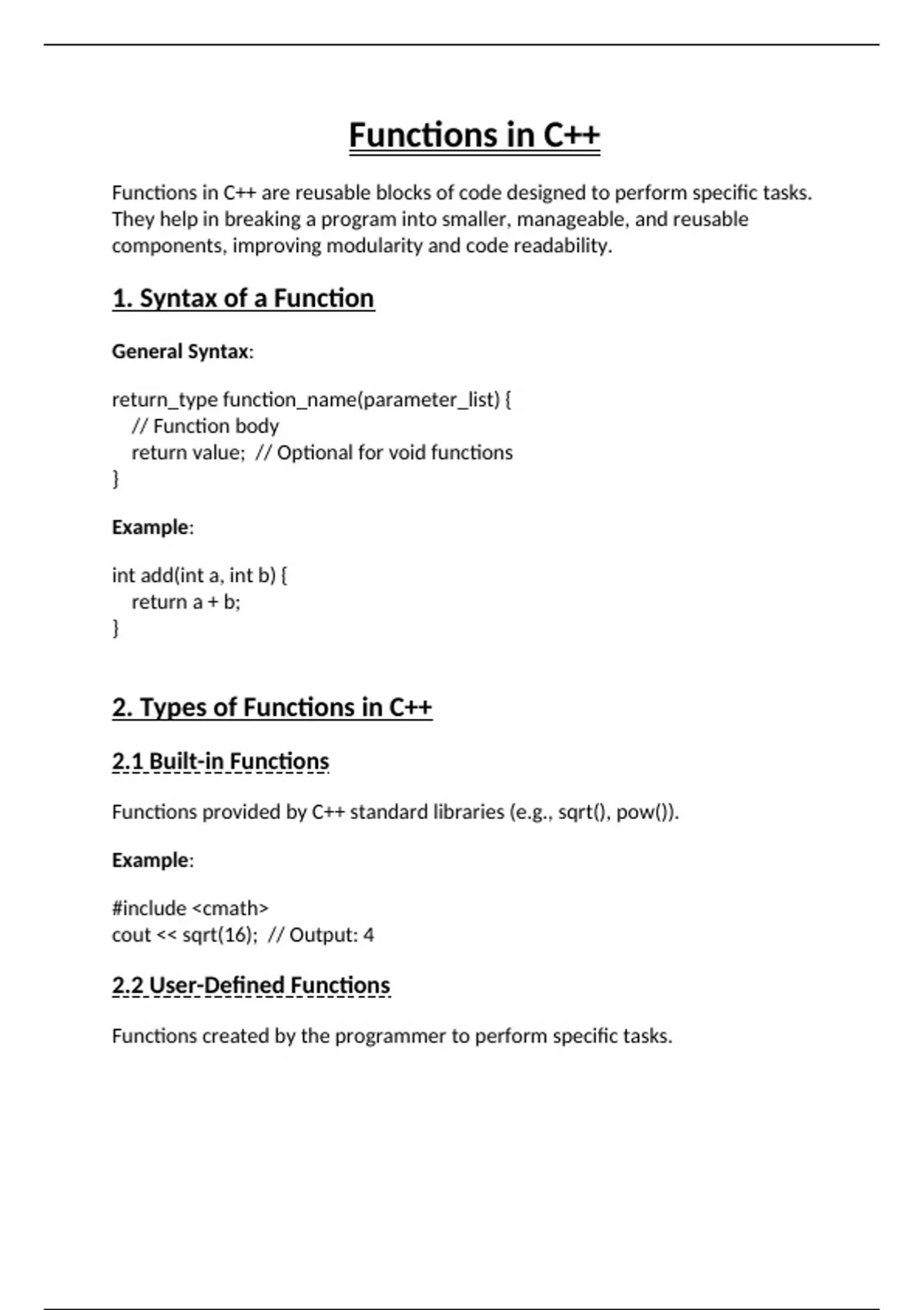 This document covers the basics of functions in C++, including how to declare, define, and call functions. Learn about parameters, return types, and how to write reusable code with examples. Perfect for first-year Computer Science students.