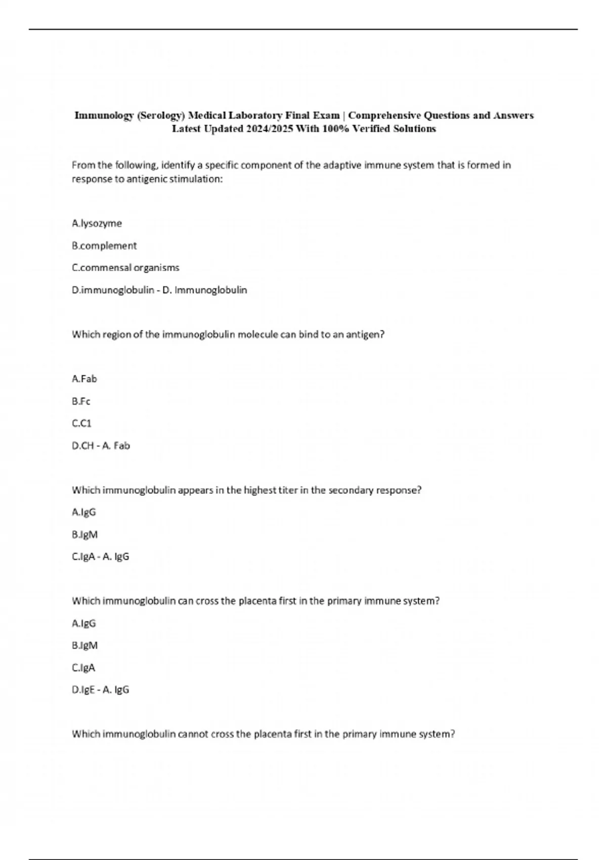 Immunology (Serology) Medical Laboratory Final Exam | Comprehensive Questions and Answers