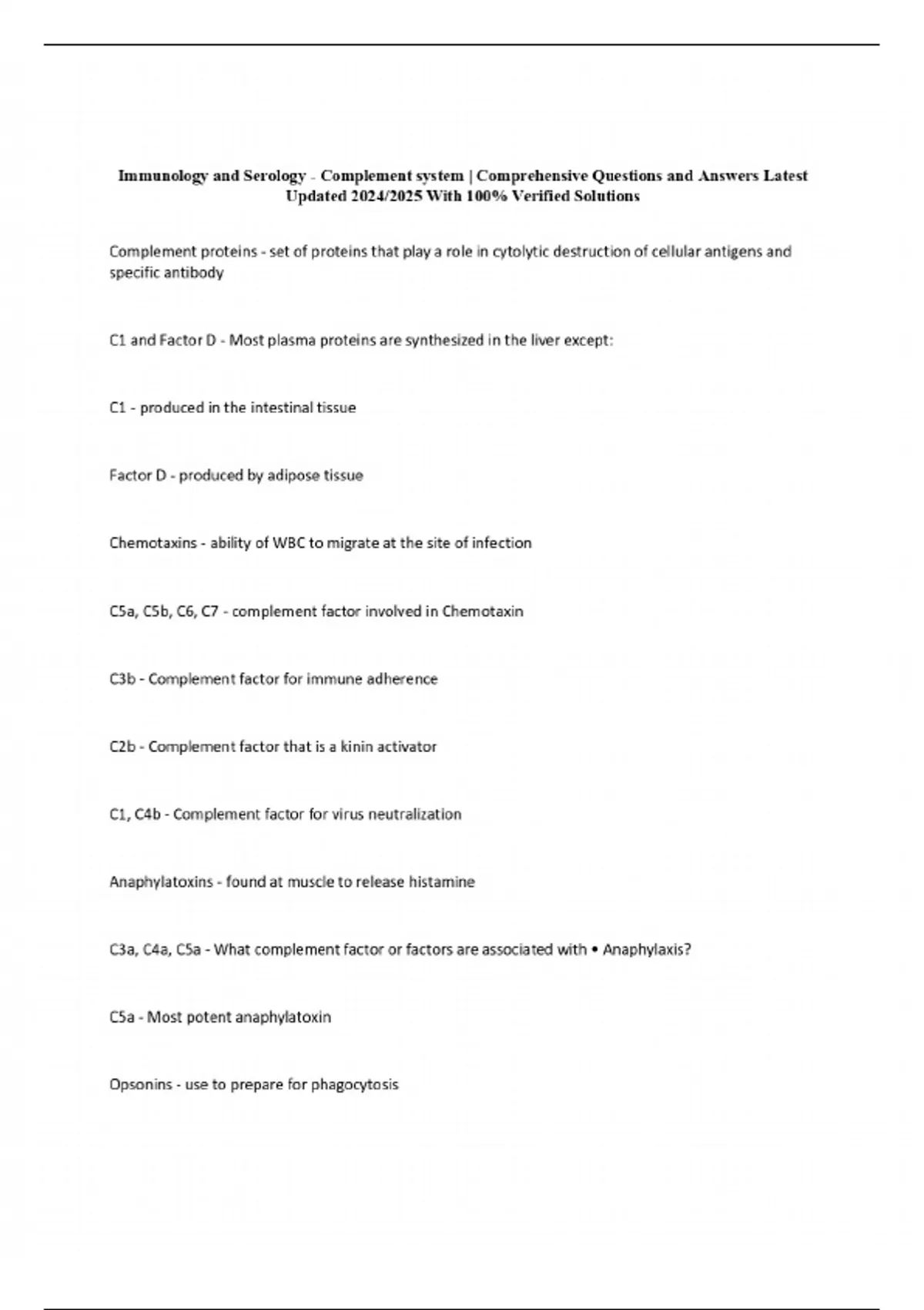 Immunology and Serology - Complement system | Comprehensive Questions and Answers