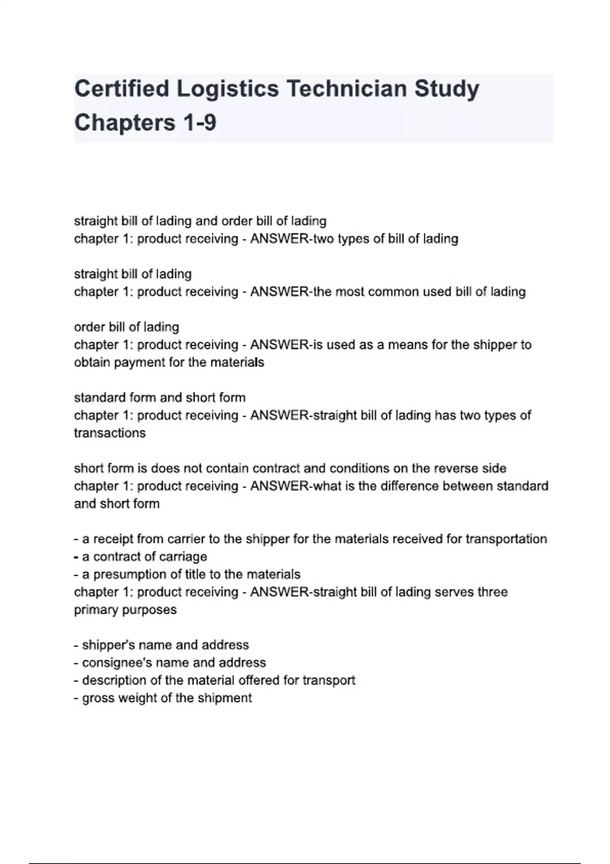 Certified Logistics Technician Study Chapters 1-9 questions and answers