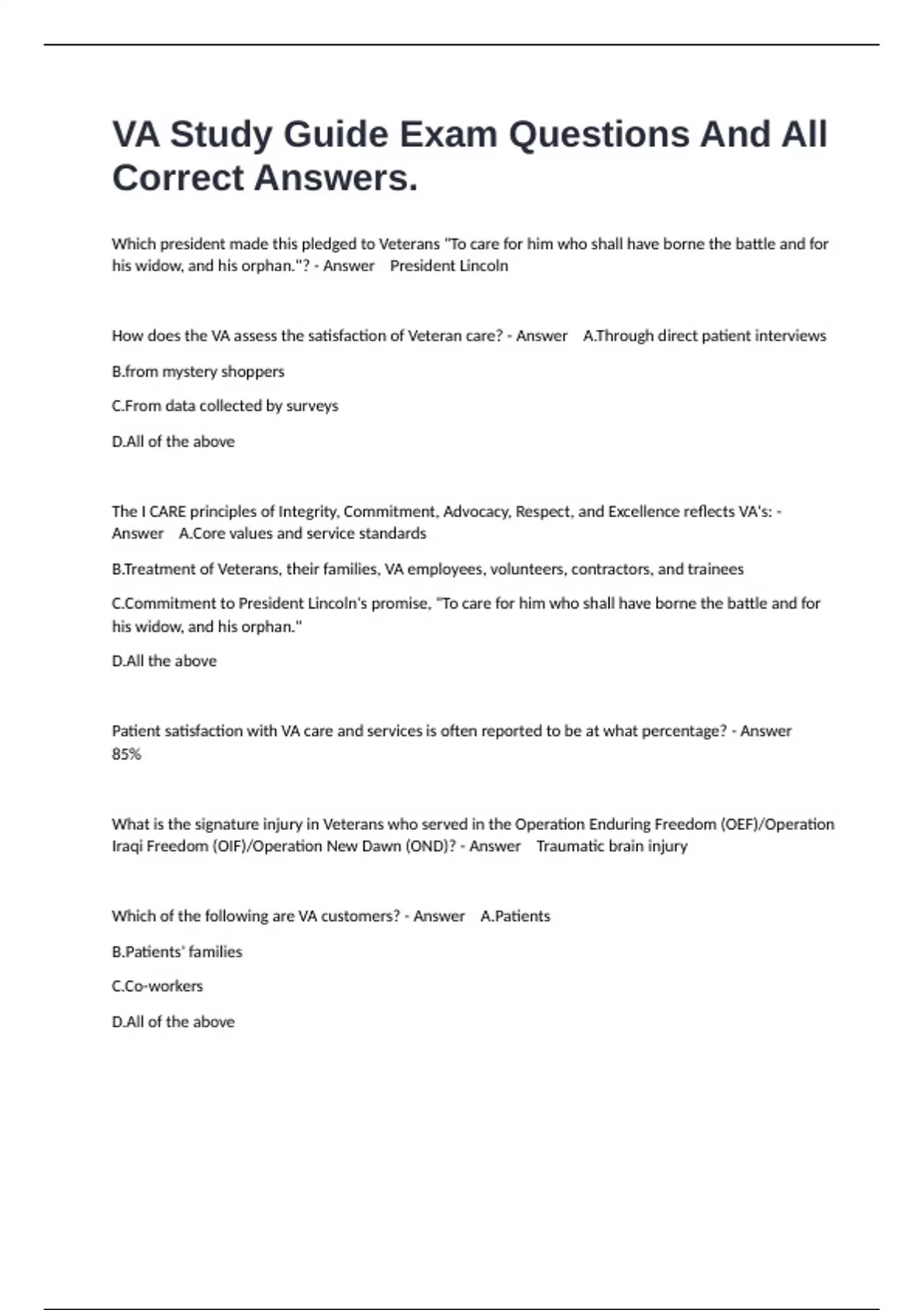 Which president made this pledged to Veterans "To care for him who shall have borne the battle and for his widow, and his orphan."? - Answer President Lincoln How does the VA assess the satisfaction of Veteran care? - Answer A.Through direct patient interviews B.from mystery shoppers C.From data collected by surveys D.All of the above The I CARE principles of Integrity, Commitment, Advocacy, Respect, and Excellence reflects VA's: - Answer A.Core values and service standards B.Treatment of Veterans, their families, VA employees, volunteers, contractors, and trainees C.Commitment to President Lincoln's promise, "To care for him who shall have borne the battle and for his widow, and his orphan." D.All the above Patient satisfaction with VA care and services is often reported to be at what percentage? - Answer 85% What is the signature injury in Veterans who served in the Operation Enduring Freedom (OEF)/Operation Iraqi Freedom (OIF)/Operation New Dawn (OND)? - Answer Traumatic brain injury Which of the following are VA customers? - Answer A.Patients B.Patients' families C.Co-workers D.All of the above