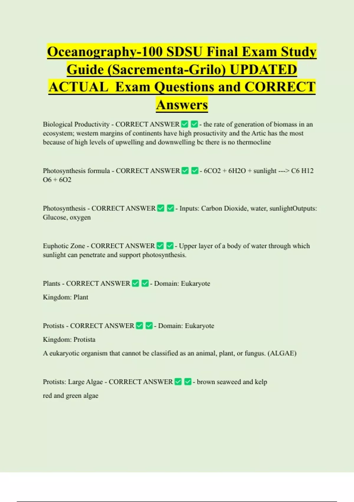 Oceanography-100 SDSU Final Exam Study Guide (Sacrementa-Grilo) UPDATED ACTUAL Exam Questions and CORRECT Answers