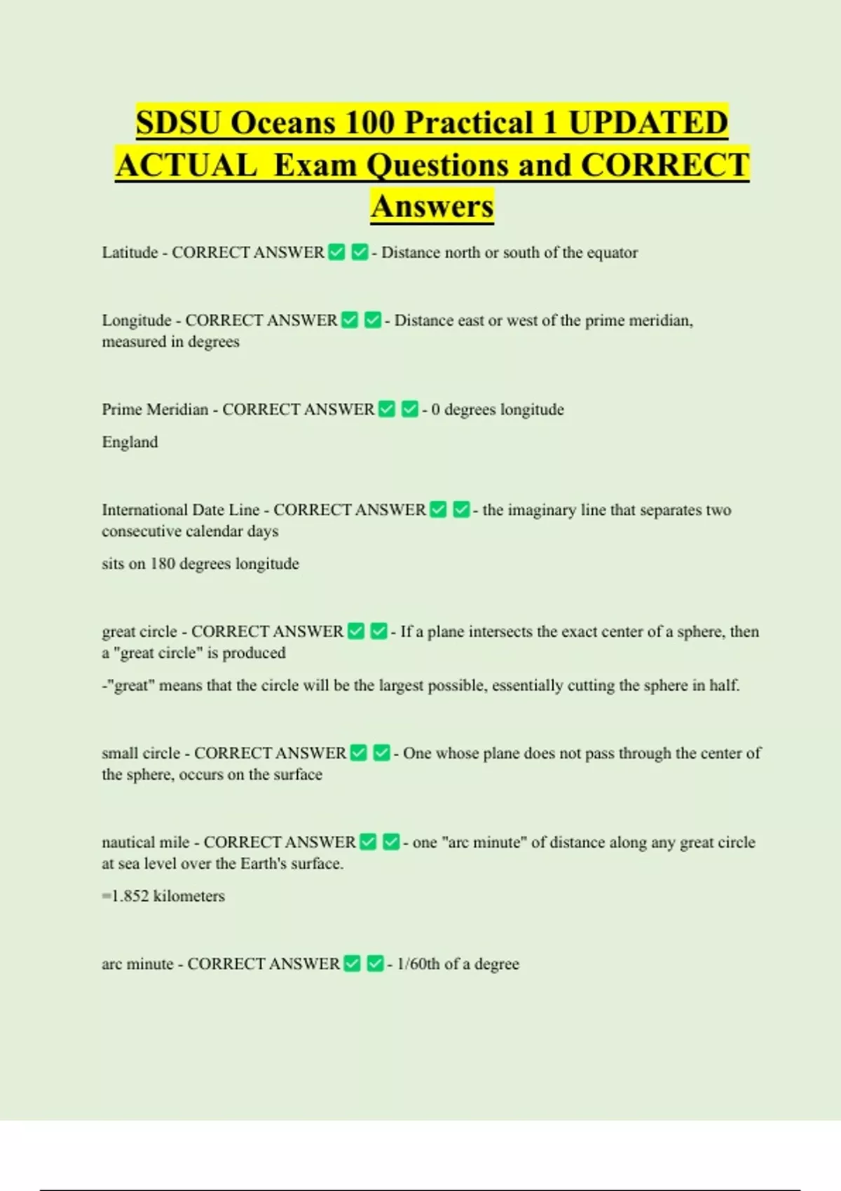 SDSU Oceans 100 Practical 1 UPDATED ACTUAL Exam Questions and CORRECT Answers Latitude - CORRECT ANSWER - Distance north or south of the equator Longitude - CORRECT ANSWER - Distance east or west of the prime meridian, measured in degrees Prime Meridian - CORRECT ANSWER - 0 degrees longitude