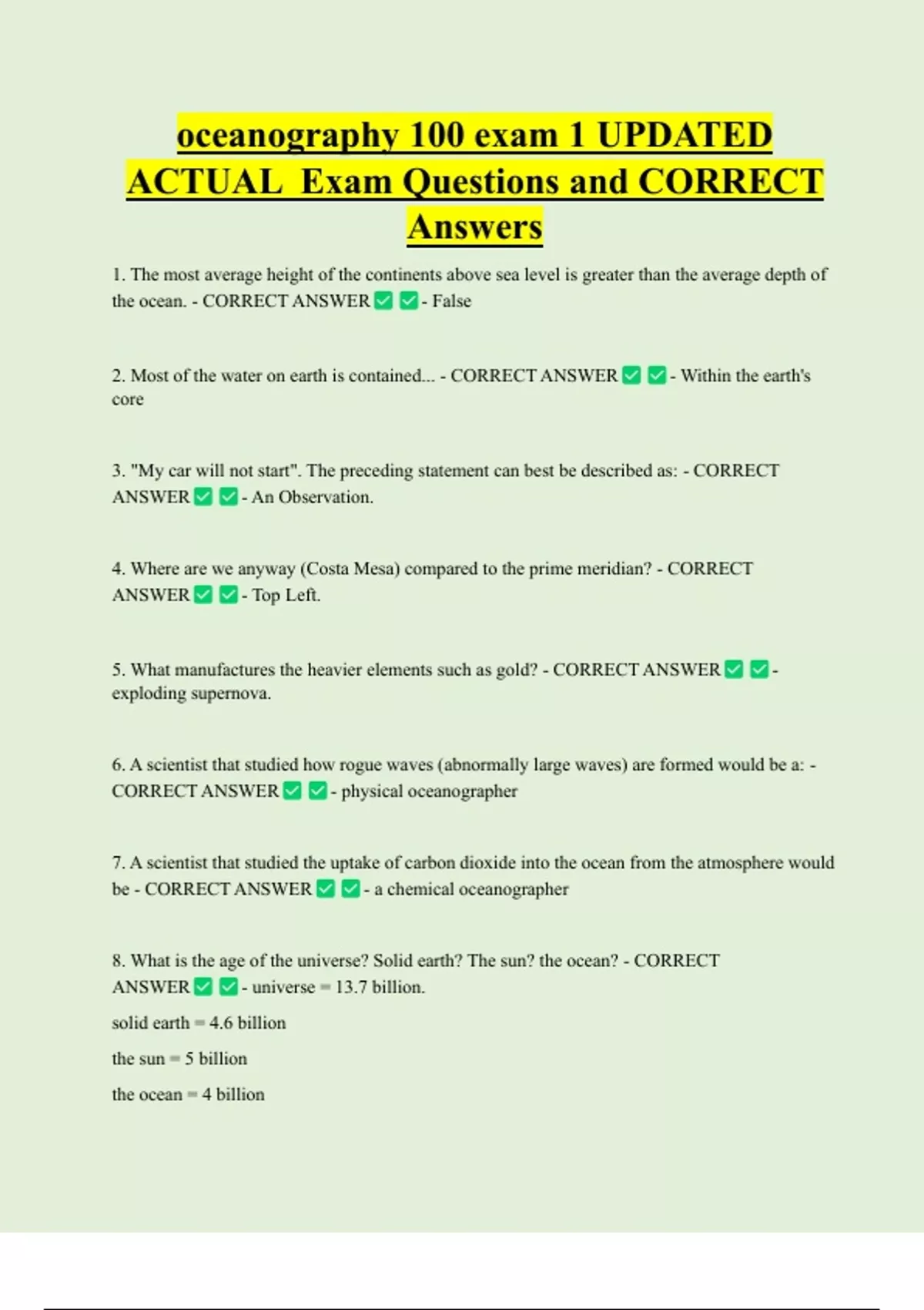 oceanography 100 exam 1 UPDATED ACTUAL Exam Questions and CORRECT Answers 1. The most average height of the continents above sea level is greater than the average depth of the ocean. - CORRECT ANSWER - False 2. Most of the water on earth is contained... - CORRECT ANSWER - Within the earth's core