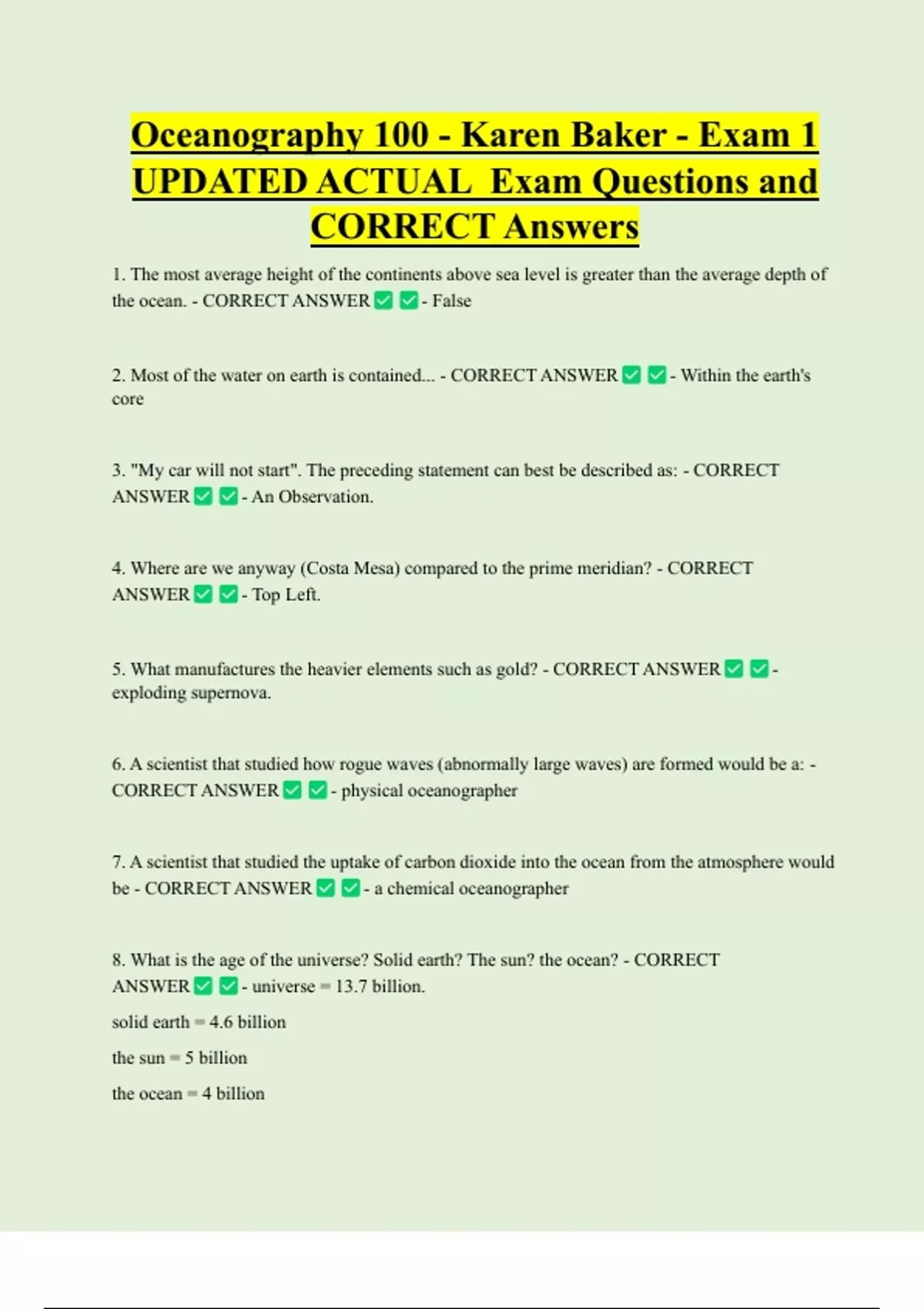 Oceanography 100 - Karen Baker - Exam 1 UPDATED ACTUAL Exam Questions and CORRECT Answers 1. The most average height of the continents above sea level is greater than the average depth of the ocean. - CORRECT ANSWER - False 2. Most of the water on earth is contained... - CORRECT ANSWER - Within the earth's core