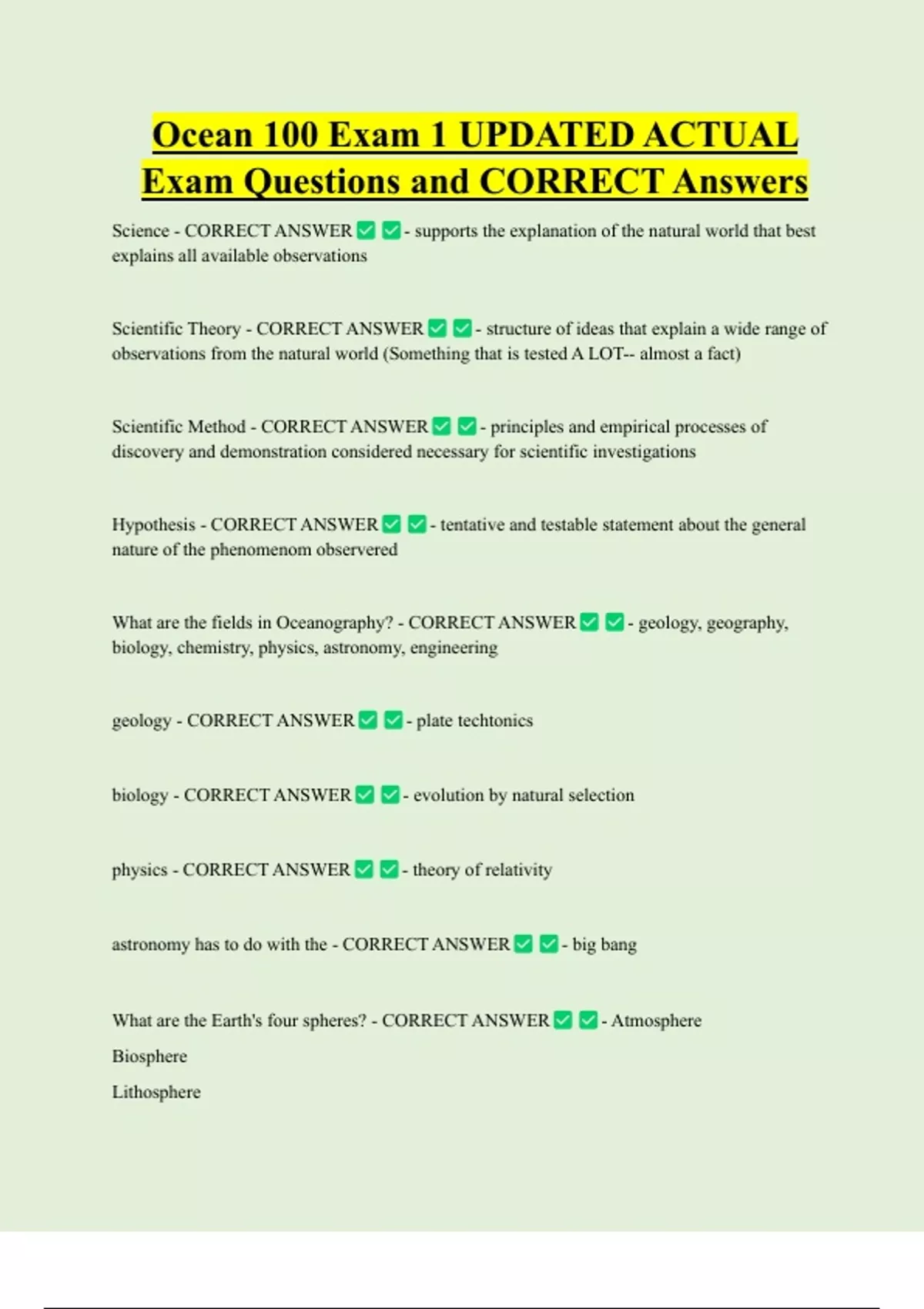 Ocean 100 Exam 1 UPDATED ACTUAL Exam Questions and CORRECT Answers Science - CORRECT ANSWER - supports the explanation of the natural world that best explains all available observations Scientific Theory - CORRECT ANSWER - structure of ideas that explain a wide range of observations from the natural world (Something that is tested A LOT-- almost a fact)
