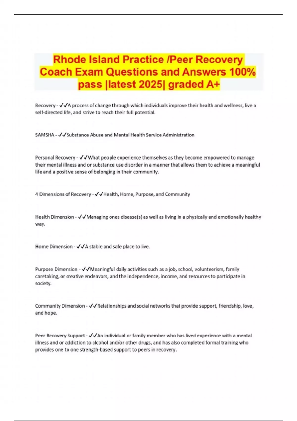 Rhode Island Practice /Peer Recovery Coach Exam Questions and Answers 100% pass |latest 2025| graded A+