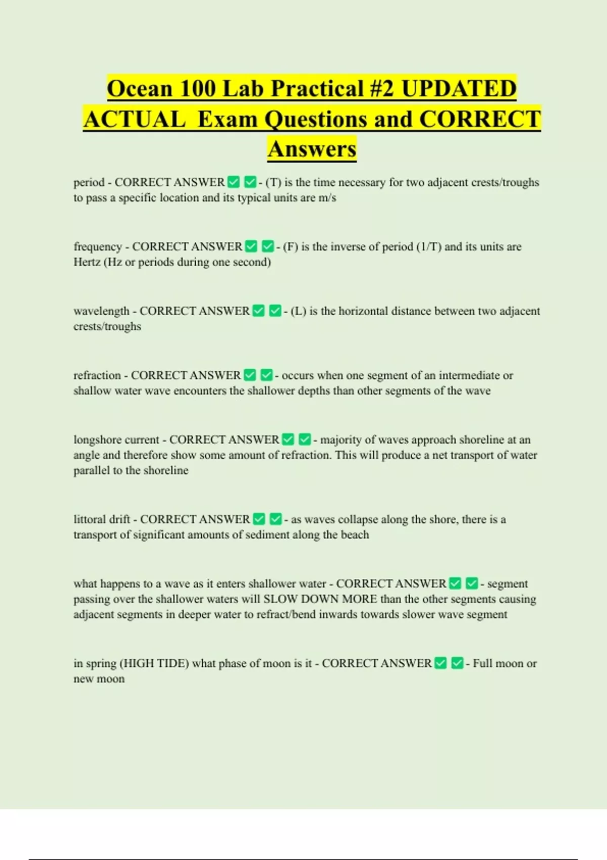 Ocean 100 Lab Practical #2 UPDATED ACTUAL Exam Questions and CORRECT Answers period - CORRECT ANSWER - (T) is the time necessary for two adjacent crests/troughs to pass a specific location and its typical units are m/s frequency - CORRECT ANSWER - (F) is the inverse of period (1/T) and its units are Hertz (Hz or periods during one second)