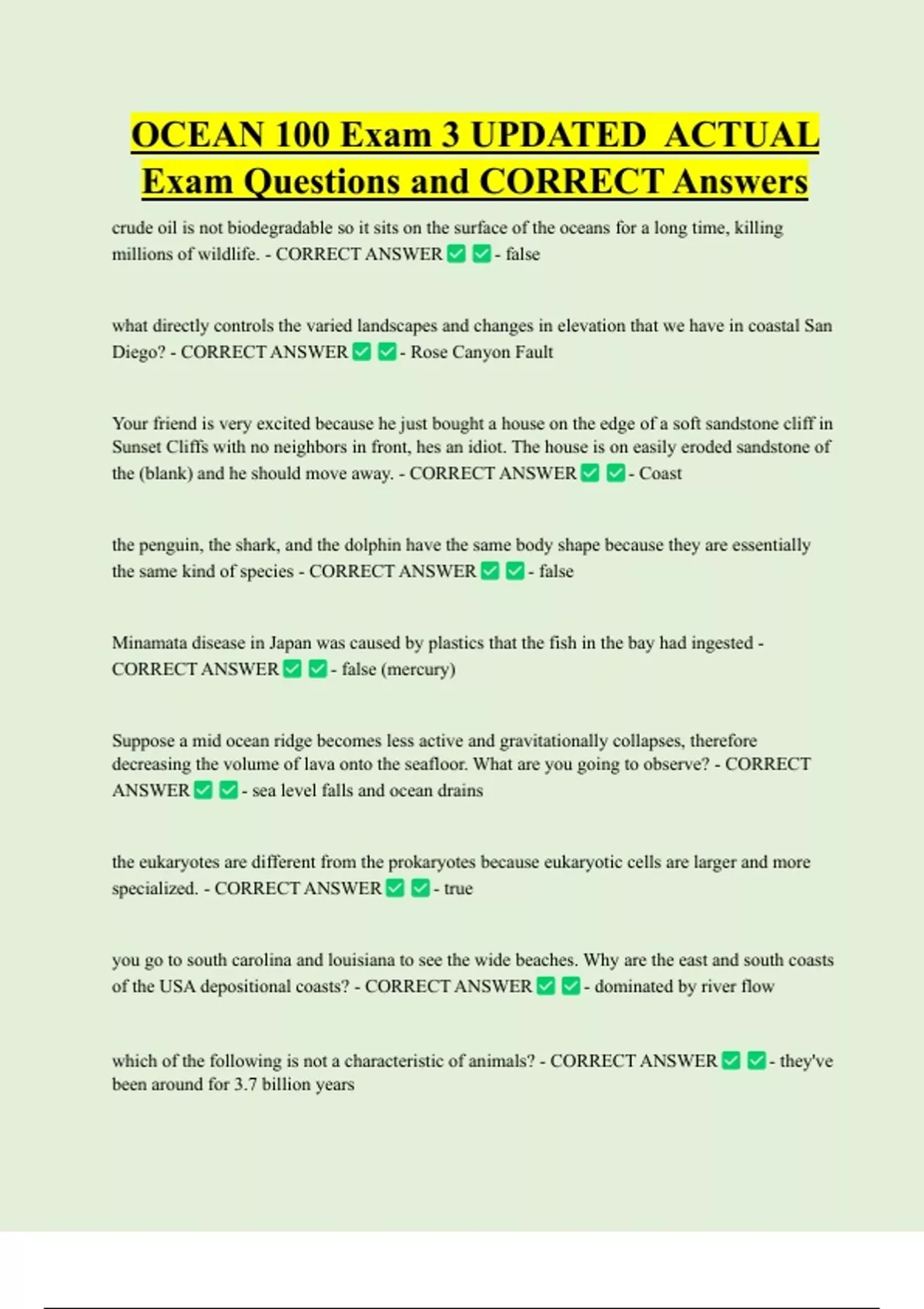 OCEAN 100 Exam 3 UPDATED ACTUAL Exam Questions and CORRECT Answers crude oil is not biodegradable so it sits on the surface of the oceans for a long time, killing millions of wildlife. - CORRECT ANSWER - false what directly controls the varied landscapes and changes in elevation that we have in coastal San Diego? - CORRECT ANSWER - Rose Canyon Fault