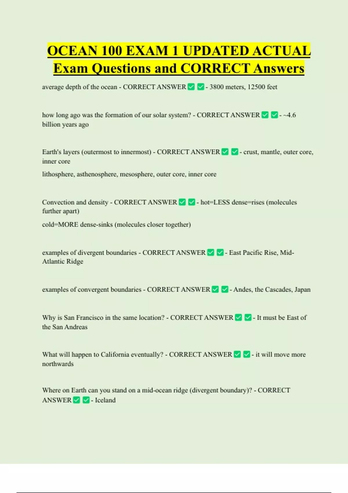 OCEAN 100 EXAM 1 UPDATED ACTUAL Exam Questions and CORRECT Answers average depth of the ocean - CORRECT ANSWER - 3800 meters, 12500 feet how long ago was the formation of our solar system? - CORRECT ANSWER - ~4.6 billion years ago Earth's layers (outermost to innermost) - CORRECT ANSWER - crust, mantle, outer core, inner core lithosphere, asthenosphere, mesosphere, outer core, inner core