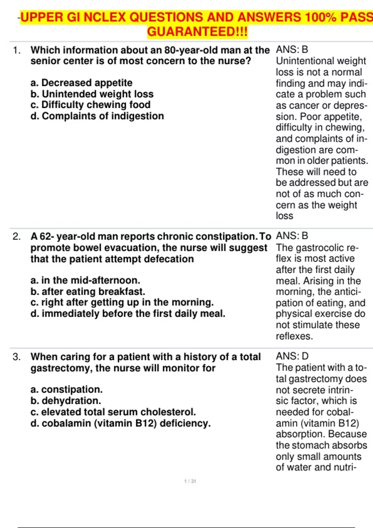 , UPPER GI NCLEX QUESTIONS AND ANSWERS 100% PASS