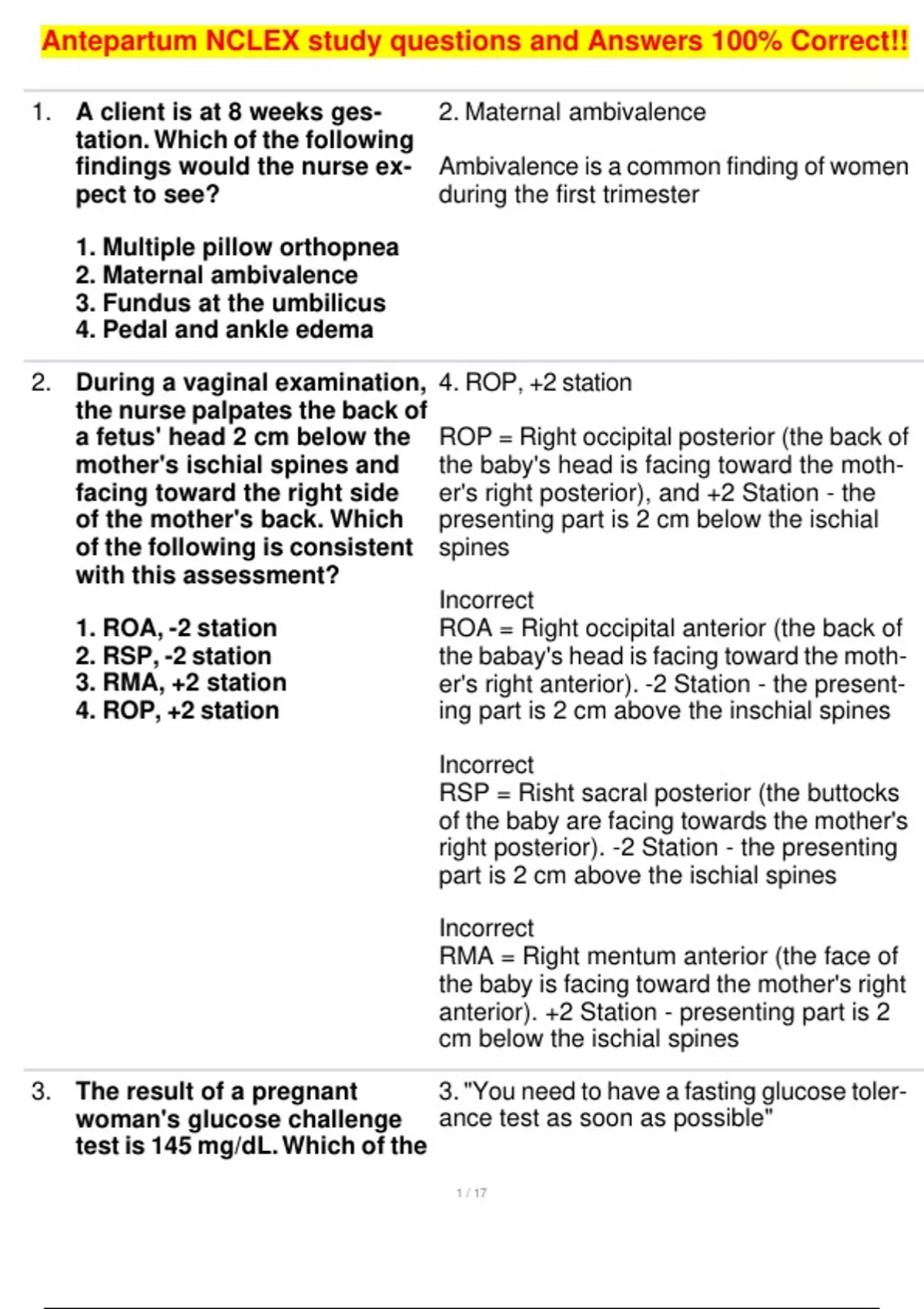 ,Antepartum NCLEX study questions and Answers 100% Correct!!