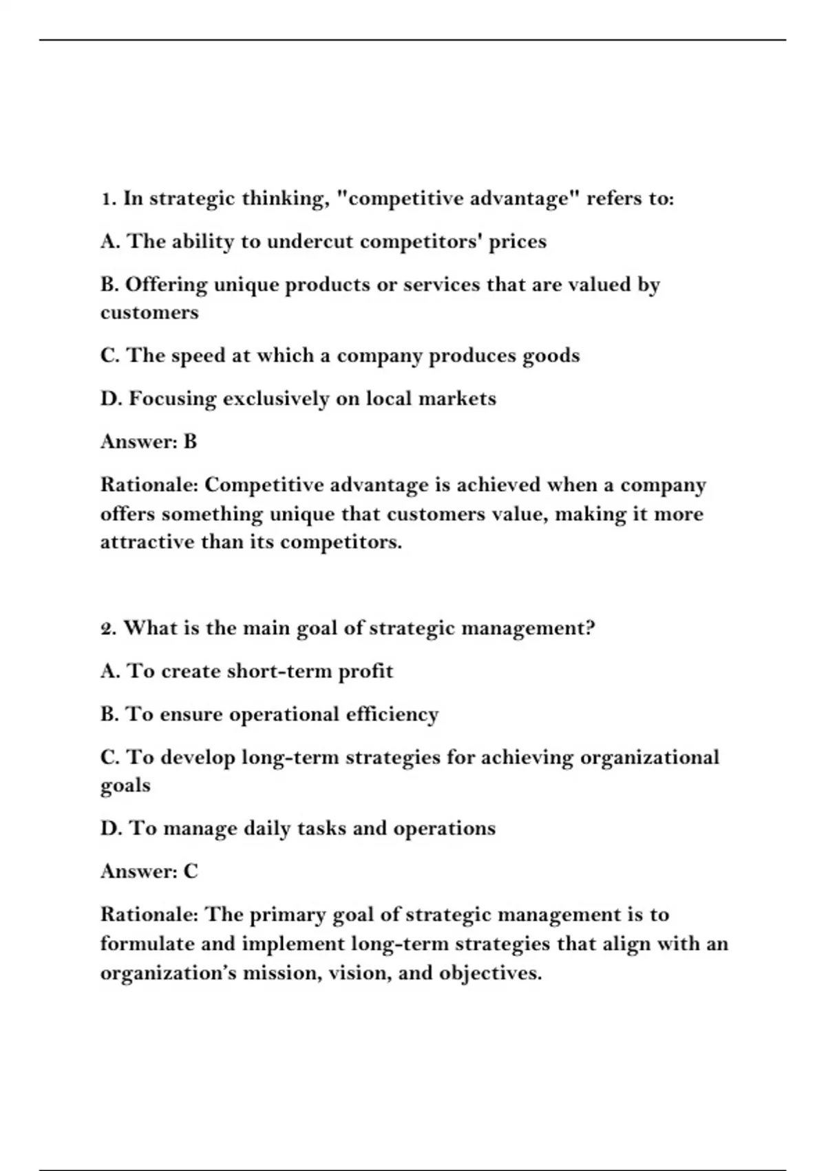 1. In strategic thinking, "competitive advantage" refers to: