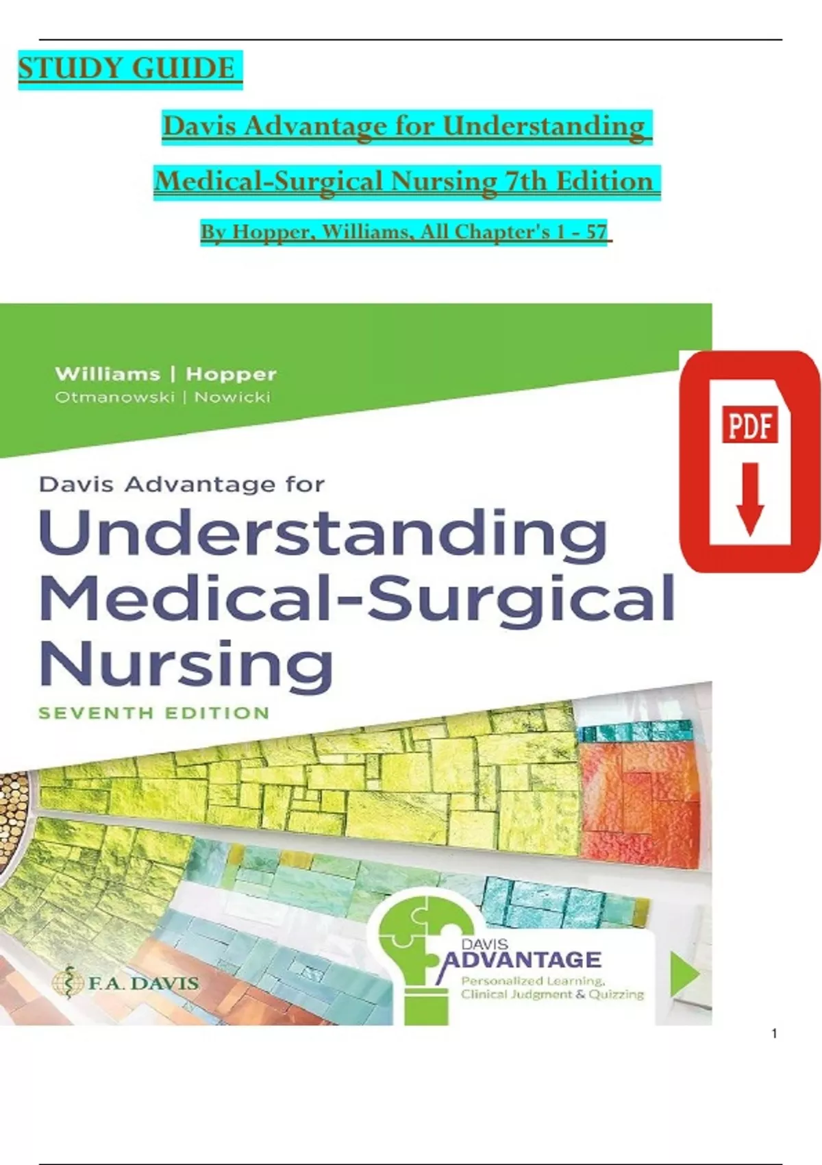 Davis Advantage for Understanding Medical-Surgical Nursing 7th Edition STUDY GUIDE By Williams & Hopper All 57 Chapters Covered, Verified Latest Edition