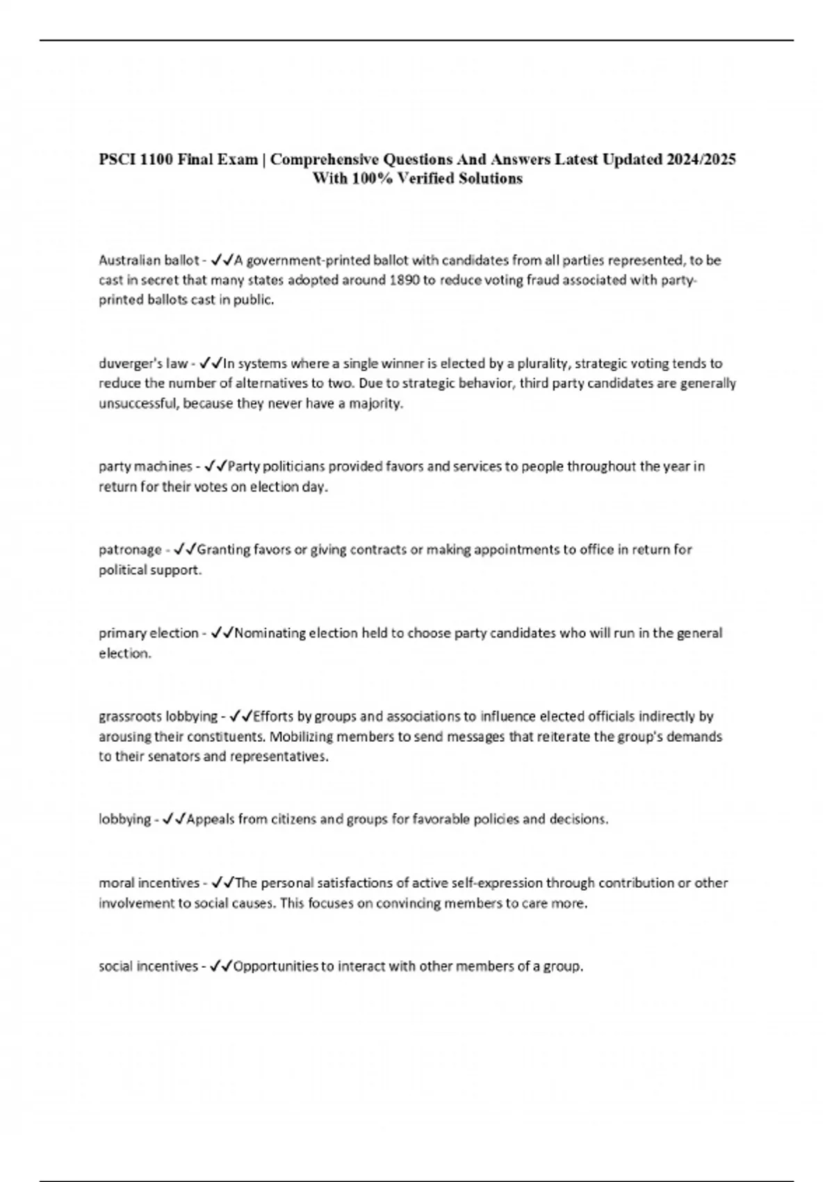 PSCI 1100 Final Exam | Comprehensive Questions And Answers