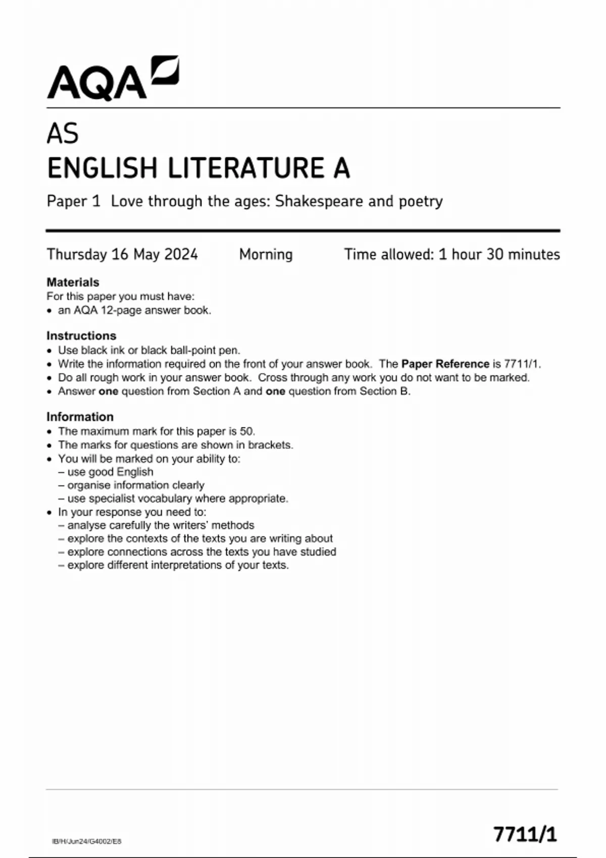 AQA As ENGLISH LITERATURE QUESTION PAPER 2024 (Paper 1;Love through the ages ,Shakespeare and poetry) 7711/1