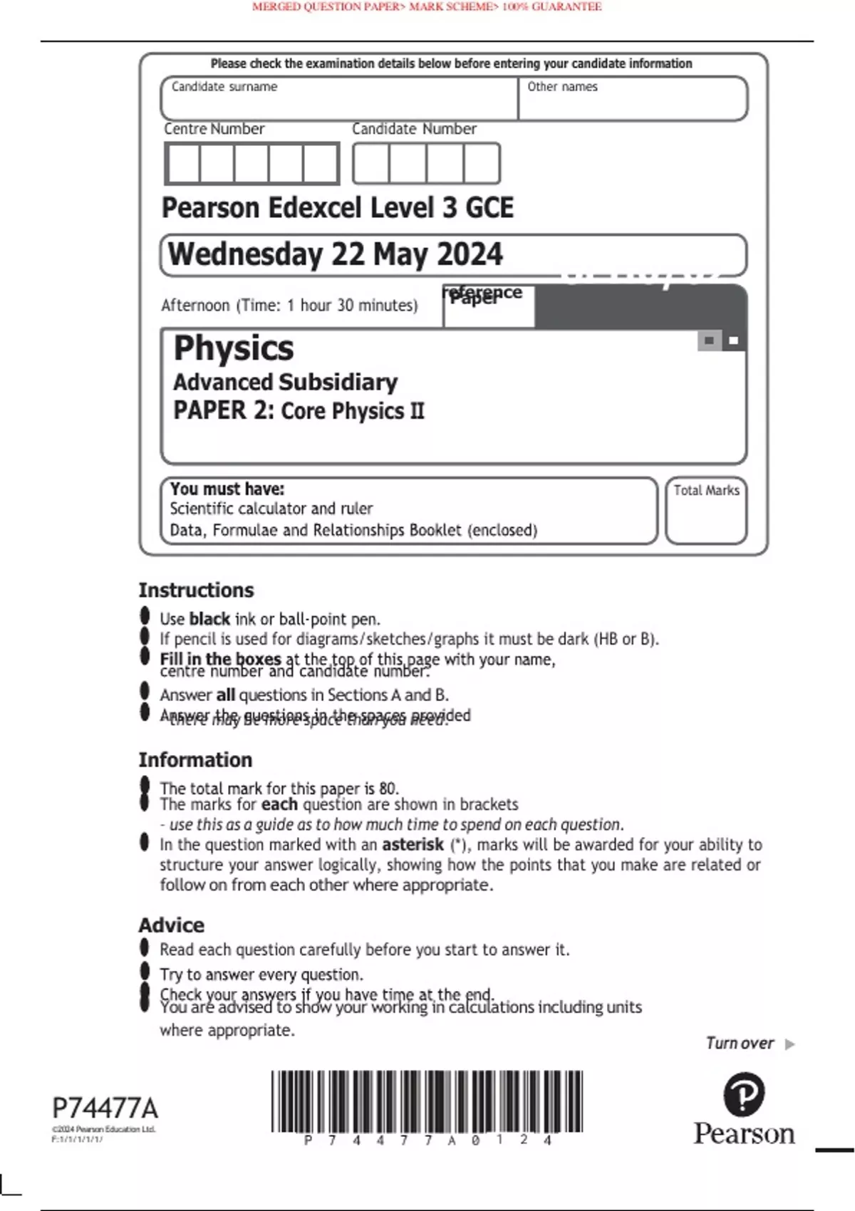 Pearson Edexcel Level 3 GCE Physics Advanced Subsidiary PAPER 2: Core Physics II Instructions • If pencil is used for diagrams/sketches/graphs it must be dark (HB or B). • Answer all questions in Sections A and B. – there may be more space than you need. Information The marks for each question are shown in brackets – use this as a guide as to how much time to spend on each question. In the question marked with an asterisk (*), marks will be awarded for your ability to structure your answer logically, showing how the points that you make are related or follow on from each other where appropriate. Advice Read each question carefully before you start to answer it. • You are advised to show your working in calculations including units P74477A ©2024 Pearson Education Ltd. F:1/1/1/1/1/ where appropriate.