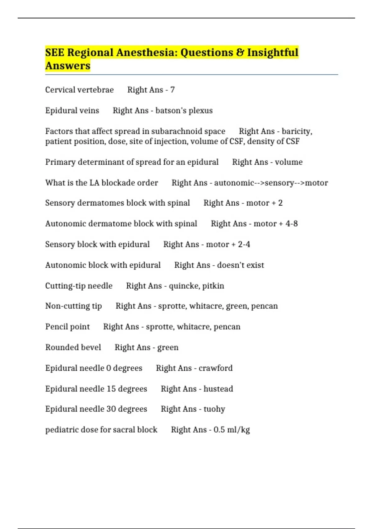 Epidural needle 0 degrees Right Ans - crawford