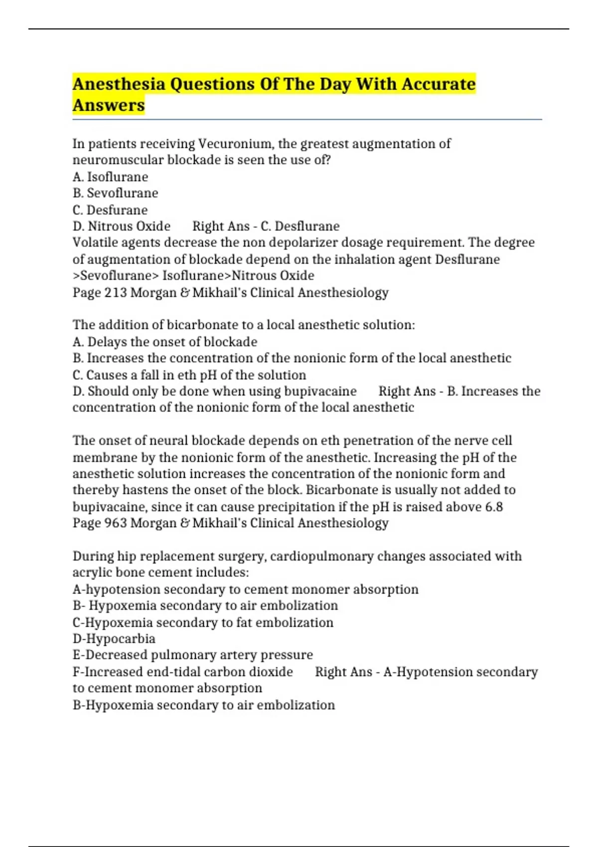 Anesthesia Questions Of The Day With Accurate Answers