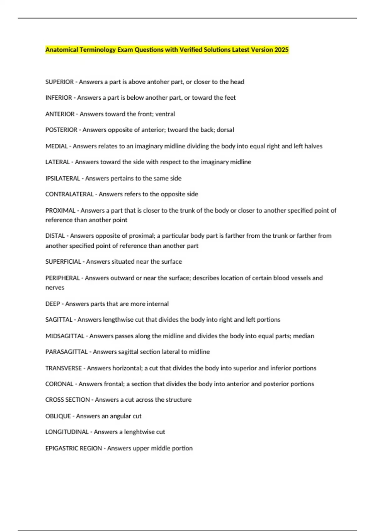 Anatomical Terminology Exam Questions with Verified Solutions Latest Version 2025 SUPERIOR - Answers a part is above antoher part, or closer to the head INFERIOR - Answers a part is below another part, or toward the feet ANTERIOR - Answers toward the front; ventral POSTERIOR - Answers opposite of anterior; twoard the back; dorsal MEDIAL - Answers relates to an imaginary midline dividing the body into equal right and left halves LATERAL - Answers toward the side with respect to the imaginary midline IPSILATERAL - Answers pertains to the same side CONTRALATERAL - Answers refers to the opposite side PROXIMAL - Answers a part that is closer to the trunk of the body or closer to another specified point of reference than another point DISTAL - Answers opposite of proximal; a particular body part is farther from the trunk or farther from another specified point of reference than another part SUPERFICIAL - Answers situated near the surface PERIPHERAL - Answers outward or near the surface; describes location of certain blood vessels and nerves DEEP - Answers parts that are more internal SAGITTAL - Answers lengthwise cut that divides the body into right and left portions MIDSAGITTAL - Answers passes along the midline and divides the body into equal parts; median PARASAGITTAL - Answers sagittal section lateral to midline TRANSVERSE - Answers horizontal; a cut that divides the body into superior and inferior portions CORONAL - Answers frontal; a section that divides the body into anterior and posterior portions CROSS SECTION - Answers a cut across the structure OBLIQUE - Answers an angular cut
