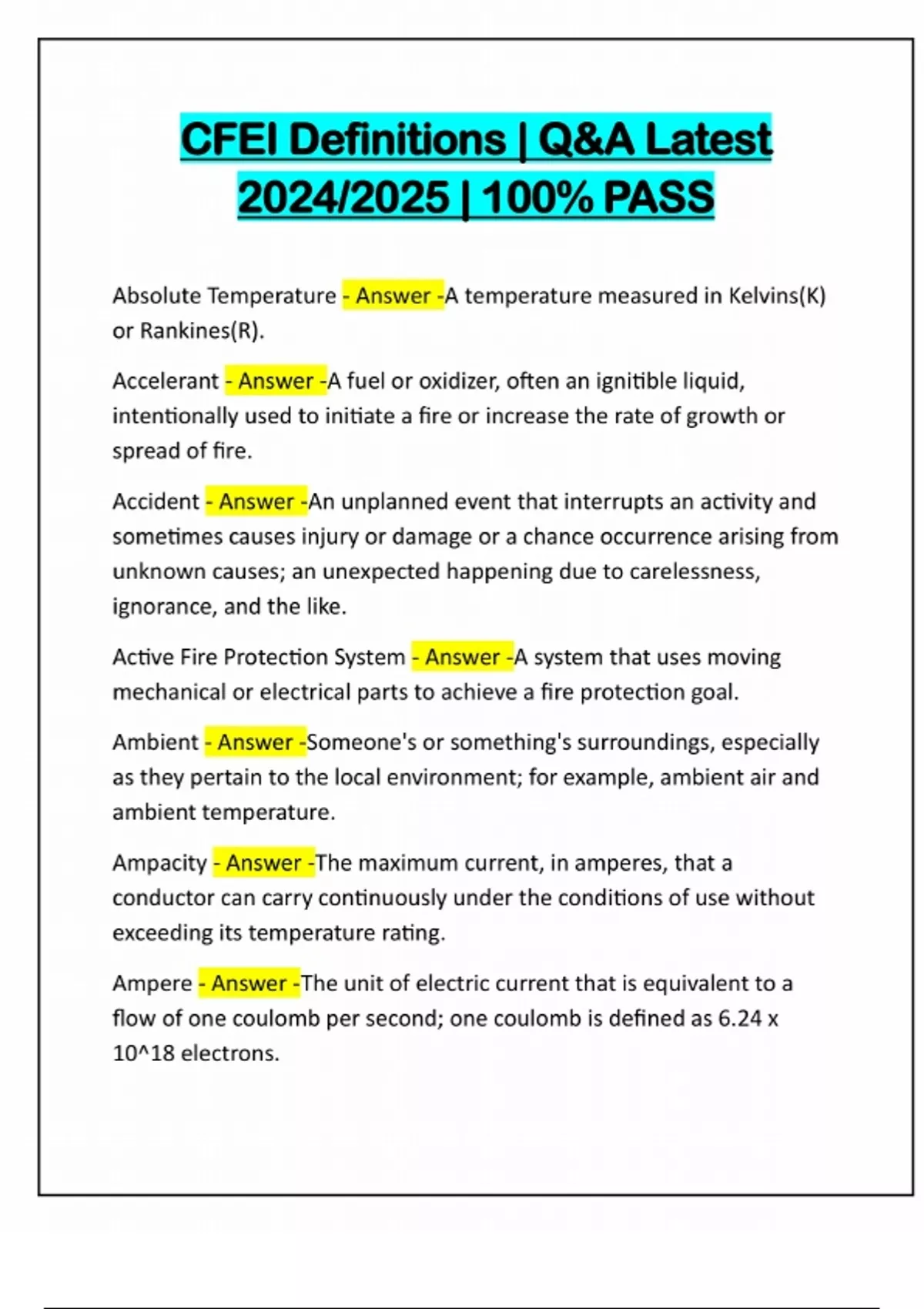 CFEI Definitions | Q&A Latest 2024/2025 | 100% PASS Absolute Temperature - Answer -A temperature measured in Kelvins(K) or Rankines(R). Accelerant - Answer -A fuel or oxidizer, often an ignitible liquid, intentionally used to initiate a fire or increase the rate of growth or spread of fire. Accident - Answer -An unplanned event that interrupts an activity and sometimes causes injury or damage or a chance occurrence arising from unknown causes; an unexpected happening due to carelessness, ignorance, and the like. Active Fire Protection System - Answer -A system that uses moving mechanical or electrical parts to achieve a fire protection goal. Ambient - Answer -Someone's or something's surroundings, especially as they pertain to the local environment; for example, ambient air and ambient temperature. Ampacity - Answer -The maximum current, in amperes, that a conductor can carry continuously under the conditions of use without exceeding its temperature rating. Ampere - Answer -The unit of electric current that is equivalent to a flow of one coulomb per second; one coulomb is defined as 6.24 x 10^18 electrons.Arc - Answer -A high-temperature luminous electric discharge across a gap or through a medium such as charred insulation. Arc Mapping - Answer -The systematic evaluation of the electrical circuit configuration, spatial relationship of the circuit components, and identification of electrical arc sites to assist in the identification of the area of origin and analysis of the fire's sprea