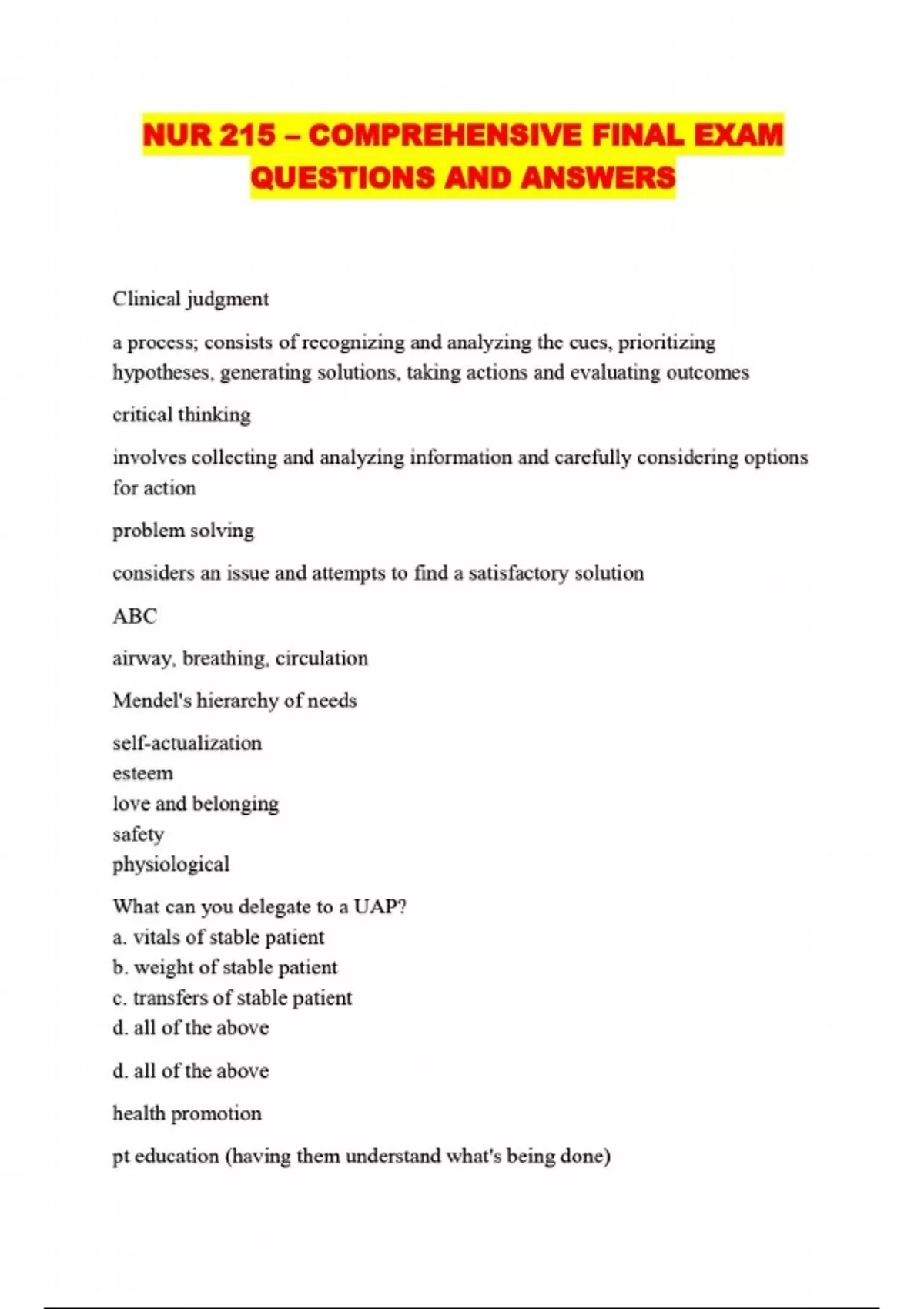 NUR 215 – COMPREHENSIVE FINAL EXAM QUESTIONS AND ANSWERS...