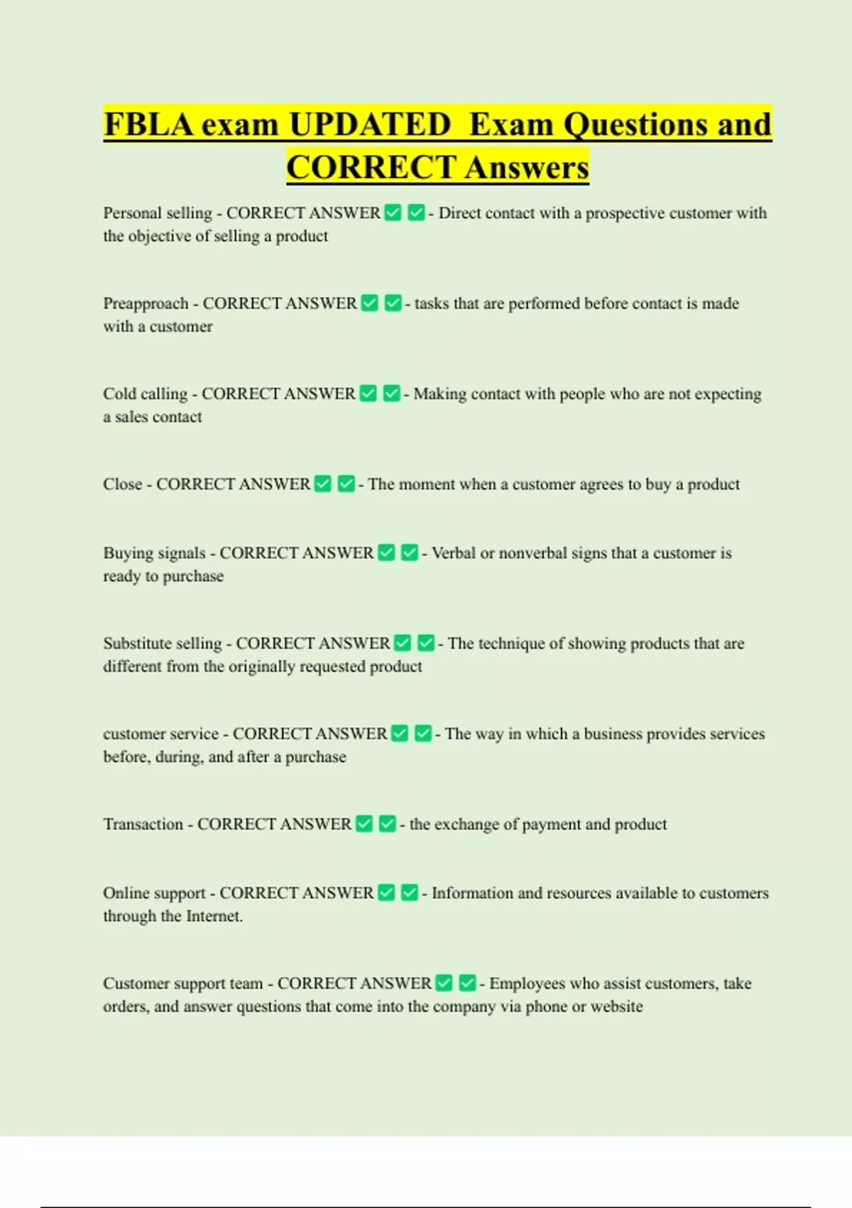 FBLA exam UPDATED Exam Questions and CORRECT Answers Personal selling - CORRECT ANSWER - Direct contact with a prospective customer with the objective of selling a product Preapproach - CORRECT ANSWER - tasks that are performed before contact is made with a customer