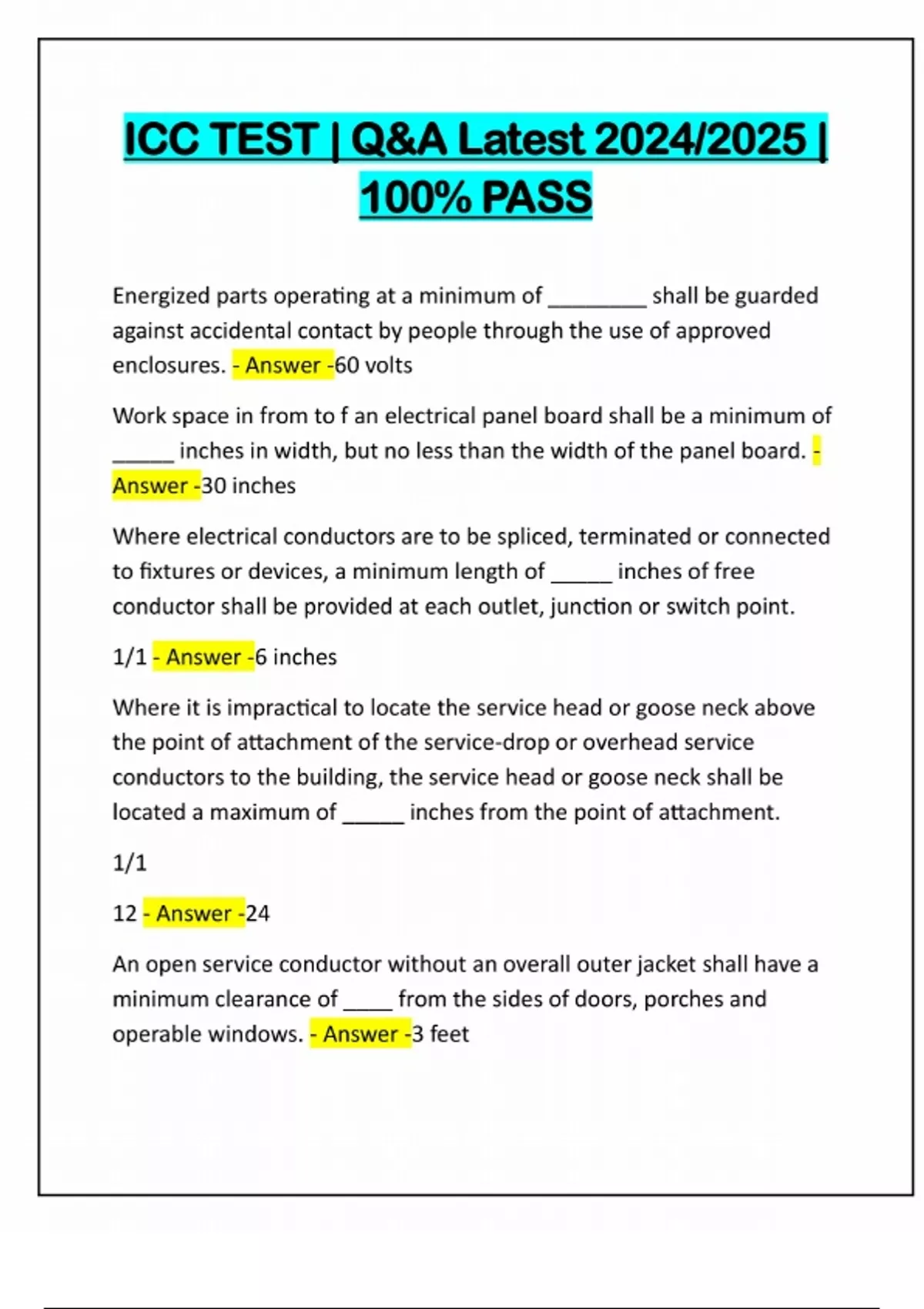 ICC TEST | Q&A Latest 2024/2025 | 100% PASS Energized parts operating at a minimum of ________ shall be guarded against accidental contact by people through the use of approved enclosures. - Answer -60 volts Work space in from to f an electrical panel board shall be a minimum of _____ inches in width, but no less than the width of the panel board. - Answer -30 inches Where electrical conductors are to be spliced, terminated or connected to fixtures or devices, a minimum length of _____ inches of free conductor shall be provided at each outlet, junction or switch point. 1/1 - Answer -6 inches Where it is impractical to locate the service head or goose neck above the point of attachment of the service-drop or overhead service conductors to the building, the service head or goose neck shall be located a maximum of _____ inches from the point of attachment. 1/1