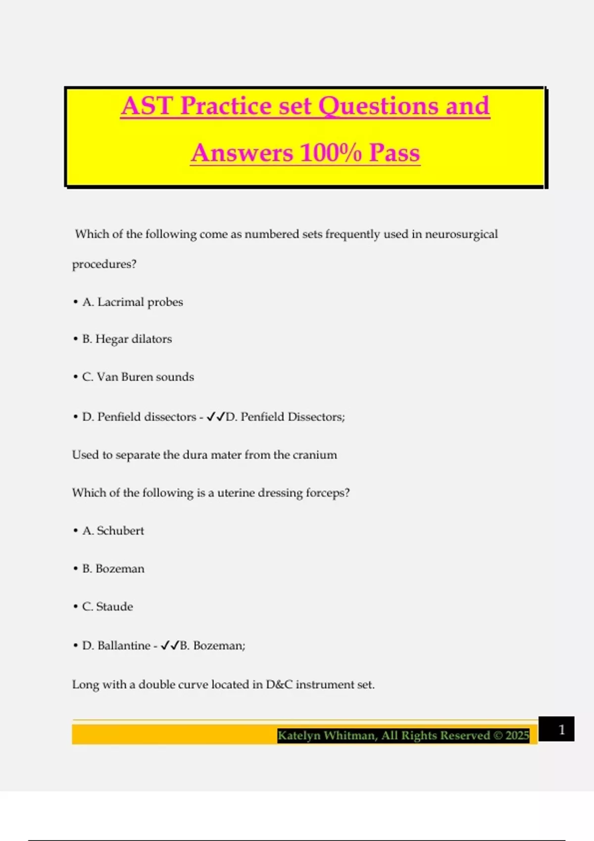 AST Practice set Questions and Answers 100% Pass Which of the following come as numbered sets frequently used in neurosurgical procedures? • A. Lacrimal probes • B. Hegar dilators • C. Van Buren sounds • D. Penfield dissectors - D. Penfield Dissectors; Used to separate the dura mater from the cranium Which of the following is a uterine dressing forceps? • A. Schubert • B. Bozeman • C. Staude • D. Ballantine - B. Bozeman; Long with a double curve located in D&C instrument set. 2Katelyn Whitman, All Rights Reserved © 2025 What is the medical term for accumulation of squamous epithelium that forms a mass that is destructive to the middle ear? • A. Otosclerosis • B. Otitis media • C. Cholesteatoma • D. Chondrolipoma - C. Cholesteatoma; Forms an encrusted mass that destroys the middle ear. Which muscle alters the shape of the lens to accommodate vision? • A. Rectus • B. Oblique • C. Circular • D. Ciliary - D. Ciliary; Alters shape to accommodate near or far vision Filiforms are used to: • A. Bypass urethral obstruction • B. Perform urethrogram • C. Stent the ureter 3Katelyn Whitman, All Rights Reserved © 2025 • D. Remove ureteral stones - A. Bypass urethral obstruction; Used to bypass an obstruction Which retractor is used to provide exposure for a femoropopliteal bypass? • A. Alm • B. Meyerding • C. Weitlaner • D. Bookwalter - C. Weitlaner; An atraumatic retractor used to facilitate exposure. Which of the following is a nonadherent, nonpermeable, occlusive surgical dressing? • A. Telfa • B. Tegasorb • C. Xeroform • D. Tegaderm - C. Xeroform; Used to create an airtight and watertight seal. Which intravenous drug would be used to reduce intracra