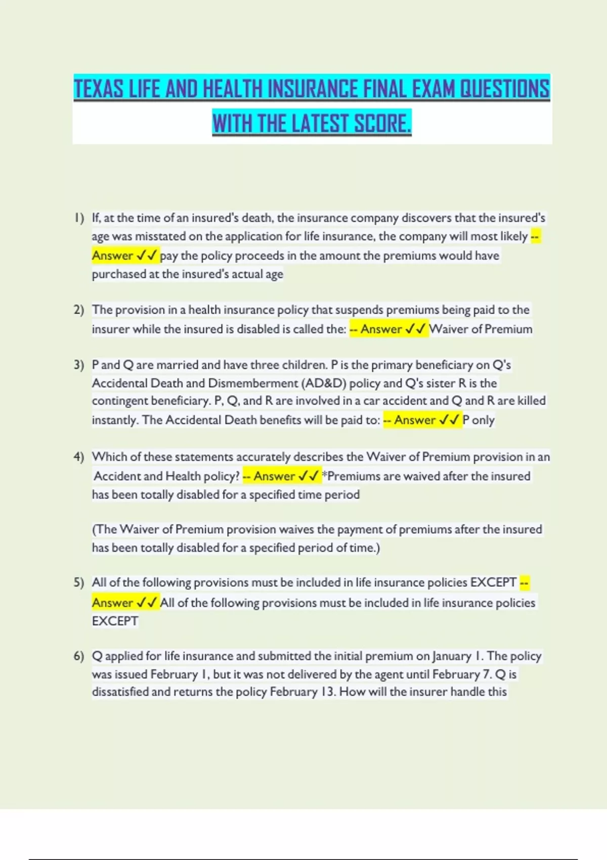 TEXAS LIFE AND HEALTH INSURANCE FINAL EXAM QUESTIONS