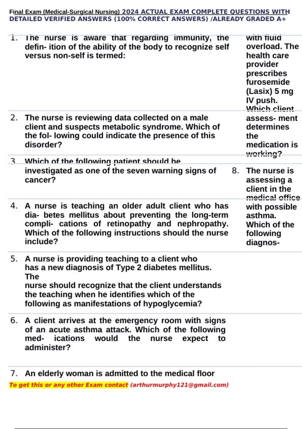 Final Exam (Medical-Surgical Nursing) 2024 ACTUAL EXAM COMPLETE QUESTIONS WITH