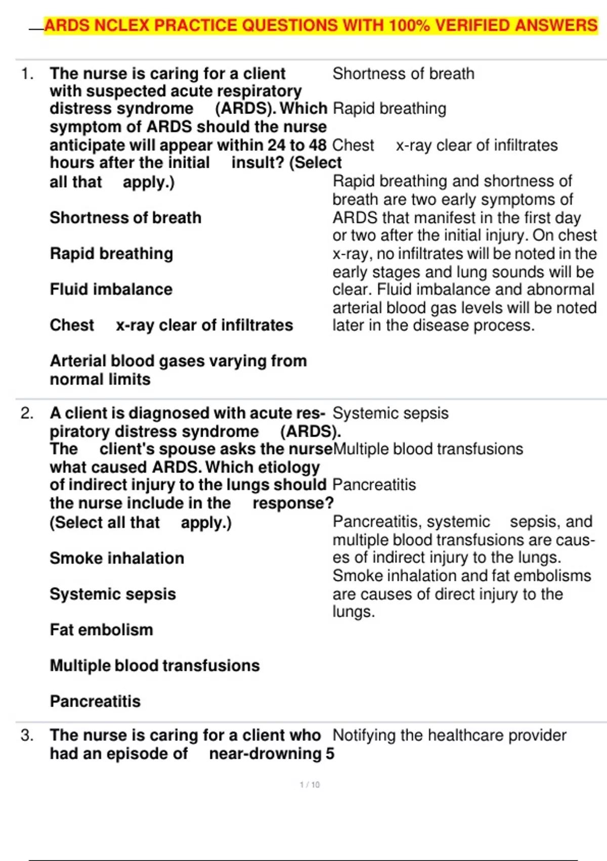 , ARDS NCLEX PRACTICE QUESTIONS WITH 100% VERIFIED ANSWERS