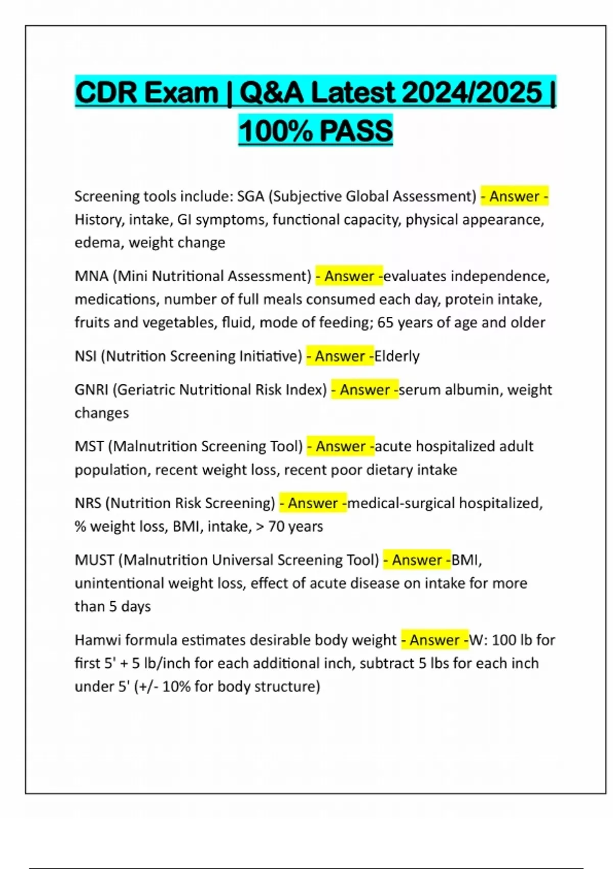 CDR Exam | Q&A Latest 2024/2025 | 100% PASS Screening tools include: SGA (Subjective Global Assessment) - Answer - History, intake, GI symptoms, functional capacity, physical appearance, edema, weight change MNA (Mini Nutritional Assessment) - Answer -evaluates independence, medications, number of full meals consumed each day, protein intake, fruits and vegetables, fluid, mode of feeding; 65 years of age and older NSI (Nutrition Screening Initiative) - Answer -Elderly GNRI (Geriatric Nutritional Risk Index) - Answer -serum albumin, weight changes MST (Malnutrition Screening Tool) - Answer -acute hospitalized adult population, recent weight loss, recent poor dietary intake NRS (Nutrition Risk Screening) - Answer -medical-surgical hospitalized, % weight loss, BMI, intake, > 70 years MUST (Malnutrition Universal Screening Tool) - Answer -BMI, unintentional weight loss, effect of acute disease on intake for more than 5 days Hamwi formula estimates desirable body weight - Answer -W: 100 lb for first 5' + 5 lb/inch for each additional inch, subtract 5 lbs for each inch under 5' (+/- 10% for body structure)M: 106 lb for 5' + 6 lb/inch, subtract 6 lbs for each inch under 5' (+/- 10% for body structure) % weight change - stresses signifigance of weight change; assess nutritional risk - Answer -UBW-ABW / UBW