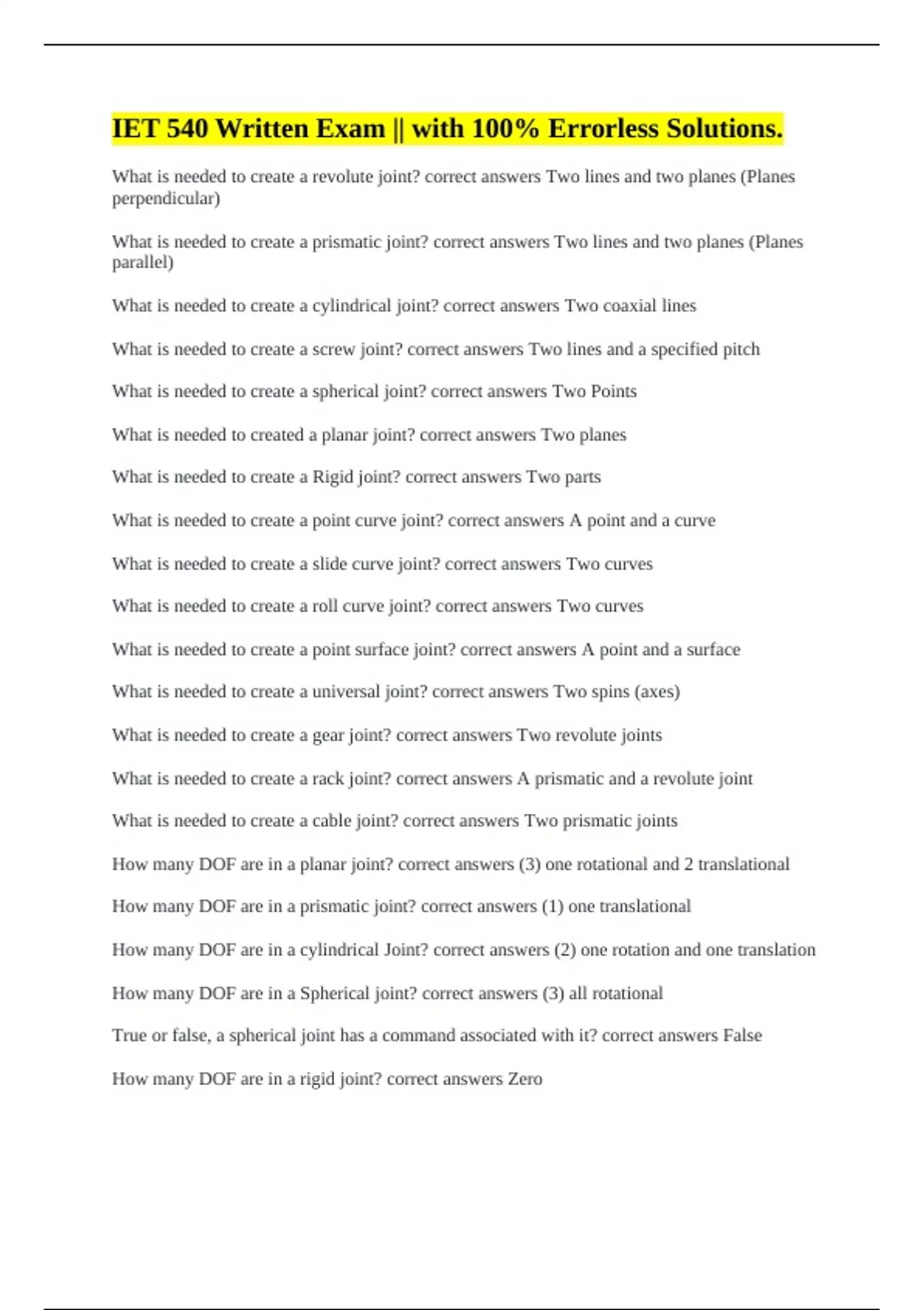 What is needed to create a revolute joint? correct answers Two lines and two planes (Planes perpendicular) What is needed to create a prismatic joint? correct answers Two lines and two planes (Planes parallel) What is needed to create a cylindrical joint? correct answers Two coaxial lines What is needed to create a screw joint? correct answers Two lines and a specified pitch What is needed to create a spherical joint? correct answers Two Points What is needed to created a planar joint? correct answers Two planes What is needed to create a Rigid joint? correct answers Two parts What is needed to create a point curve joint? correct answers A point and a curve What is needed to create a slide curve joint? correct answers Two curves What is needed to create a roll curve joint? correct answers Two curves What is needed to create a point surface joint? correct answers A point and a surface What is needed to create a universal joint? correct answers Two spins (axes) What is needed to create a gear joint? correct answers Two revolute joints What is needed to create a rack joint? correct answers A prismatic and a revolute joint What is needed to create a cable joint? correct answers Two prismatic joints How many DOF are in a planar joint? correct answers (3) one rotational and 2 translational How many DOF are in a prismatic joint? correct answers (1) one translational How many DOF are in a cylindrical Joint? correct answers (2) one rotation and one translation How many DOF are in a Spherical joint? correct answers (3) all rotational True or false, a spherical joint has a command associated with it? correct answers False How many DOF are in a rigid joint? correct answers Zero