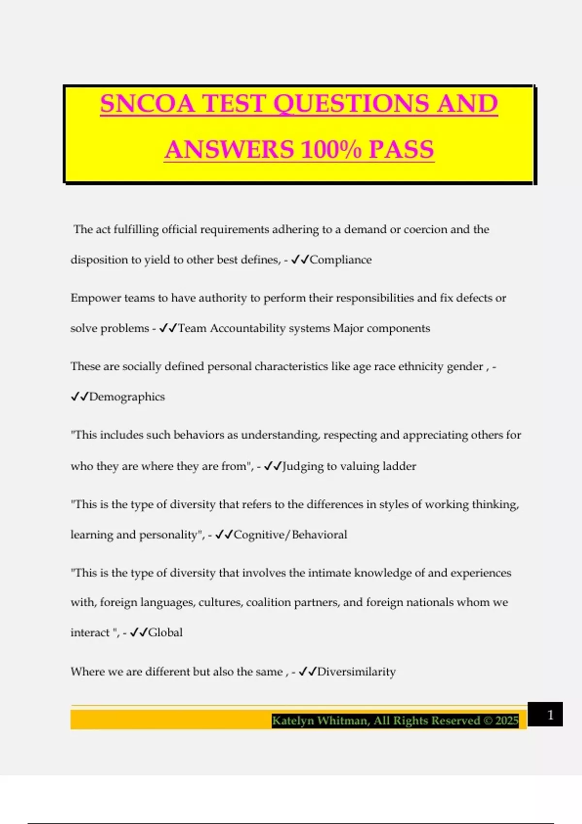 SNCOA TEST QUESTIONS AND ANSWERS 100% PASS The act fulfilling official requirements adhering to a demand or coercion and the disposition to yield to other best defines, - Compliance Empower teams to have authority to perform their responsibilities and fix defects or solve problems - Team Accountability systems Major components These are socially defined personal characteristics like age race ethnicity gender , - Demographics "This includes such behaviors as understanding, respecting and appreciating others for who they are where they are from", - Judging to valuing ladder "This is the type of diversity that refers to the differences in styles of working thinking, learning and personality", - Cognitive/Behavioral "This is the type of diversity that involves the intimate knowledge of and experiences with, foreign languages, cultures, coalition partners, and foreign nationals whom we interact ", - Global Where we are different but also the same , - Diversimilarity 2Katelyn Whitman, All Rights Reserved © 2025 discovery Assessment exploration revitalization transfromatin, - 5 step transformation process This is the type of diversity that affects interaction between military service component, occupations, and career fields - Organizational structure "These provide individuals with challenging tasks, a sense of responsibility, and opportunities to grow and develop", - Inclusive Environments "This is a composite of individual characteristics, experiences and abilities", - Diversity "FRLD term where leaders observe the different needs, abilities, and aspirations of their followers ", - Individual consideration What is used to prioritize key requirements for the upcoming fiscal year and ensures funds provided in presidential budget are distributed in such a manner as to ensure AF program objectives are complete, - Financial execution plan (FEP) What is a law that gives congress constitutional control over government spending, - Anti-deficiency act (ADA Organizational Management Program Management and Control Requirements determination and performance management, - What are the