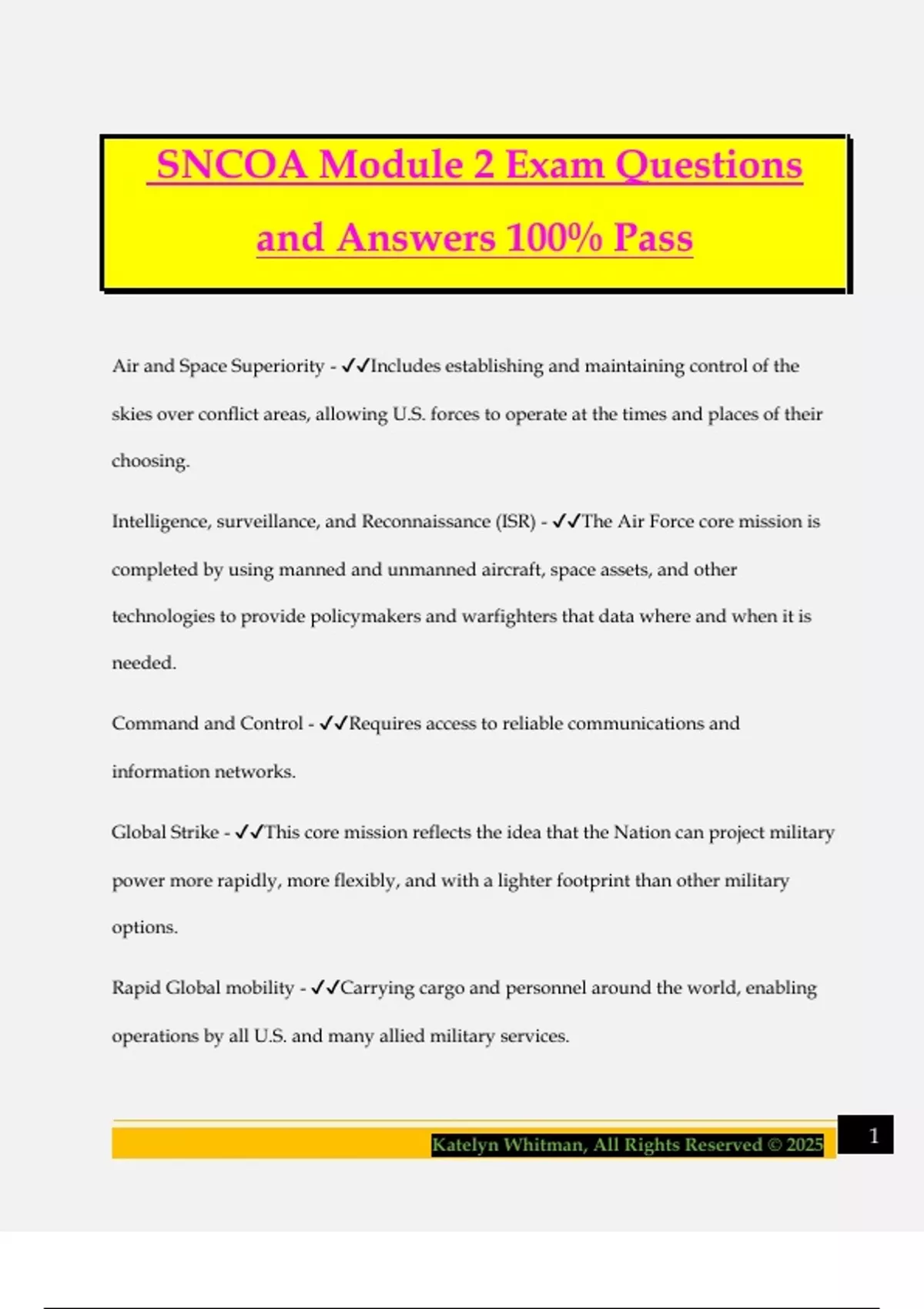 SNCOA Module 2 Exam Questions and Answers 100% Pass Air and Space Superiority - Includes establishing and maintaining control of the skies over conflict areas, allowing U.S. forces to operate at the times and places of their choosing. Intelligence, surveillance, and Reconnaissance (ISR) - The Air Force core mission is completed by using manned and unmanned aircraft, space assets, and other technologies to provide policymakers and warfighters that data where and when it is needed. Command and Control - Requires access to reliable communications and information networks. Global Strike - This core mission reflects the idea that the Nation can project military power more rapidly, more flexibly, and with a lighter footprint than other military options. Rapid Global mobility - Carrying cargo and personnel around the world, enabling operations by all U.S. and many allied military services. 2Katelyn Whitman, All Rights Reserved © 2025 Air and Space Superiority - Freedom from attack and freedom to attack. Rapid Global mobility - Delivery on demand. Global strike - Any target any time. Air superiority - This has provided our nation with a decades-long asymmetric advantage. Joint force coalition partners have come to expect this mission-essential capability that over 115,000 of America's Airmen delivery daily. This statement BEST describes which of the following Air Force capabilities? Global Strike - Its missions include a wide range of crisis response and escalation control options, such as providing close air support to troops at risk, interdicting enemy forces, inserting special operations forces, and targeting an adversary's vital centers. This statement BEST describes which of the following