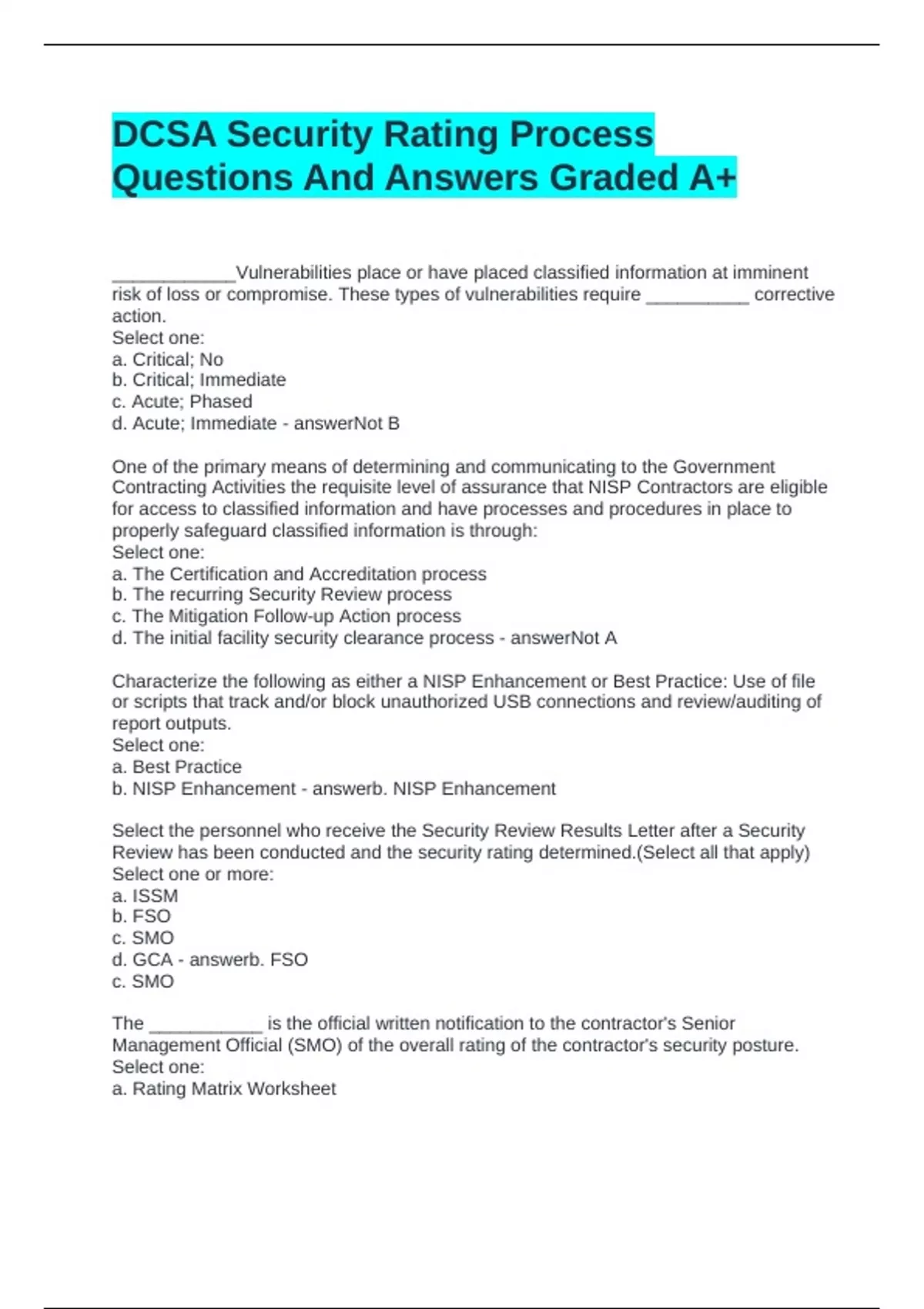 DCSA Security Rating Process Questions And Answers Graded A+ ____________Vulnerabilities place or have placed classified information at imminent risk of loss or compromise. These types of vulnerabilities require __________ corrective action. Select one: a. Critical; No b. Critical; Immediate c. Acute; Phased d. Acute; Immediate Not B One of the primary means of determining and communicating to the Government Contracting Activities the requisite level of assurance that NISP Contractors are eligible for access to classified information and have processes and procedures in place to properly safeguard classified information is through: Select one: a. The Certification and Accreditation process b. The recurring Security Review process c. The Mitigation Follow-up Action process d. The initial facility security clearance process Not A Characterize the following as either a NISP Enhancement or Best Practice: Use of file or scripts that track and/or block unauthorized USB connections and review/auditing of report outputs. Select one: a. Best Practice b. NISP Enhancement b. NISP Enhancement Select the personnel who receive the Security Review Results Letter after a Security Review has been conducted and the security rating determined.(Select all that apply) Select one or more: a. ISSM b. FSO c. SMO d. GCA b. FSO c. SMO The ___________ is the official written notification to the contractor's Senior Management Official (SMO) of the overall rating of the contractor's security posture. Select one: a. Rating Matrix Worksheet b. Facility Security Clearance Maintenance Letter c. Security Review Results Letter d. Security Review Report Not D For Security Reviews with Vulnerabilities (Non-Acute/Non-Critical) identified, the IS Rep/ISSP may conduct a follow-up action if the contractor fails to provide a written response specifying corrective actions taken or the corrective actions are deemed to be insufficient. Select one: True False True