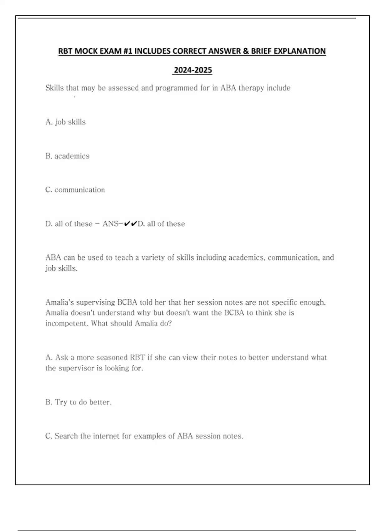 RBT MOCK EXAM #1 INCLUDES CORRECT ANSWER & BRIEF EXPLANATION Skills that may be assessed and programmed for in ABA therapy include A. job skills B. academics C. communication D. all of these - ANS-D. all of these ABA can be used to teach a variety of skills including academics, communication, and job skills. Amalia's supervising BCBA told her that her session notes are not specific enough. Amalia doesn't understand why but doesn't want the BCBA to think she is incompetent. What should Amalia do? A. Ask a more seasoned RBT if she can view their notes to better understand what the supervisor is looking for. B. Try to do better. C. Search the internet for examples of ABA session notes. D. Address the issue during supervision and ask for written examples of the type of notes the BCBA wants. - ANS-D