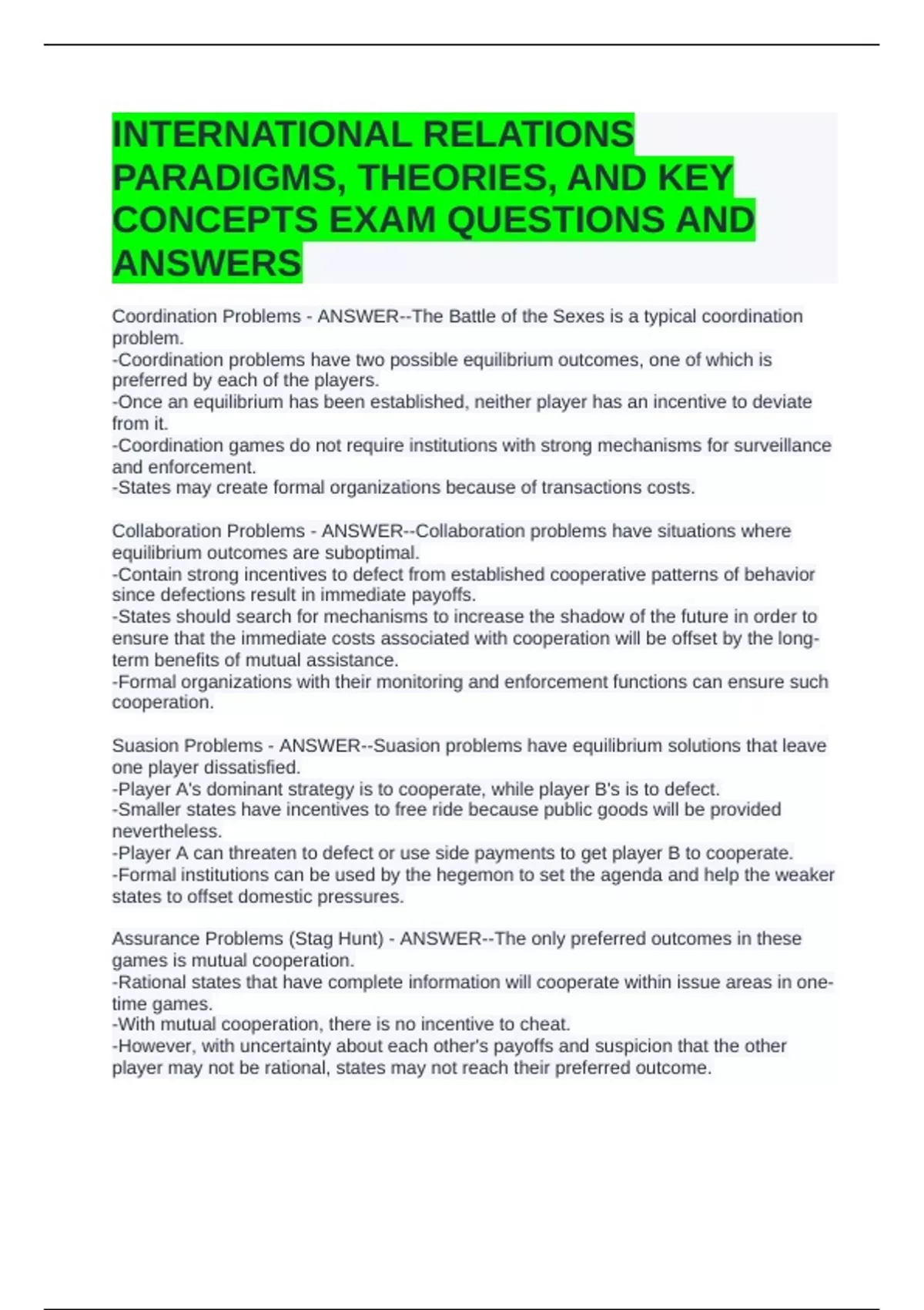 Assurance Problems (Stag Hunt) - ANSWER--The only preferred outcomes in these