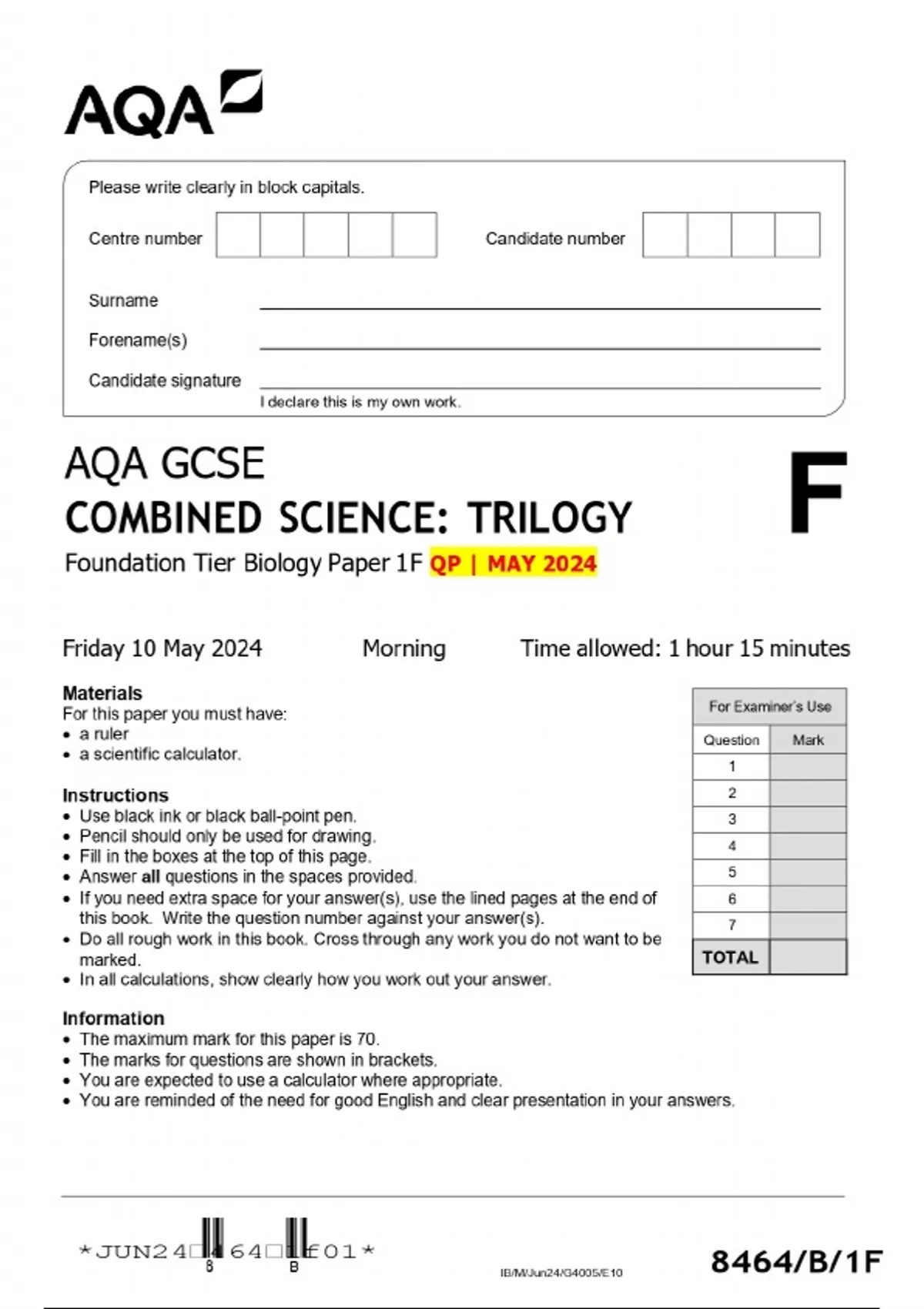 AQA GCSE COMBINED SCIENCE: TRILOGY Foundation Tier Biology Paper 1F QP | MAY 2024
