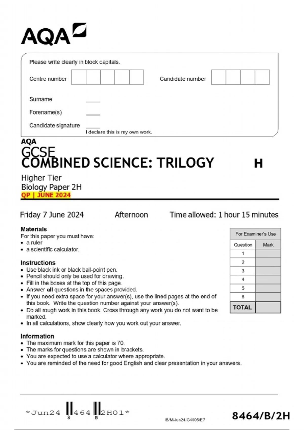AQA GCSE COMBINED SCIENCE: TRILOGY H Higher Tier Biology Paper 2H QP | JUNE 2024