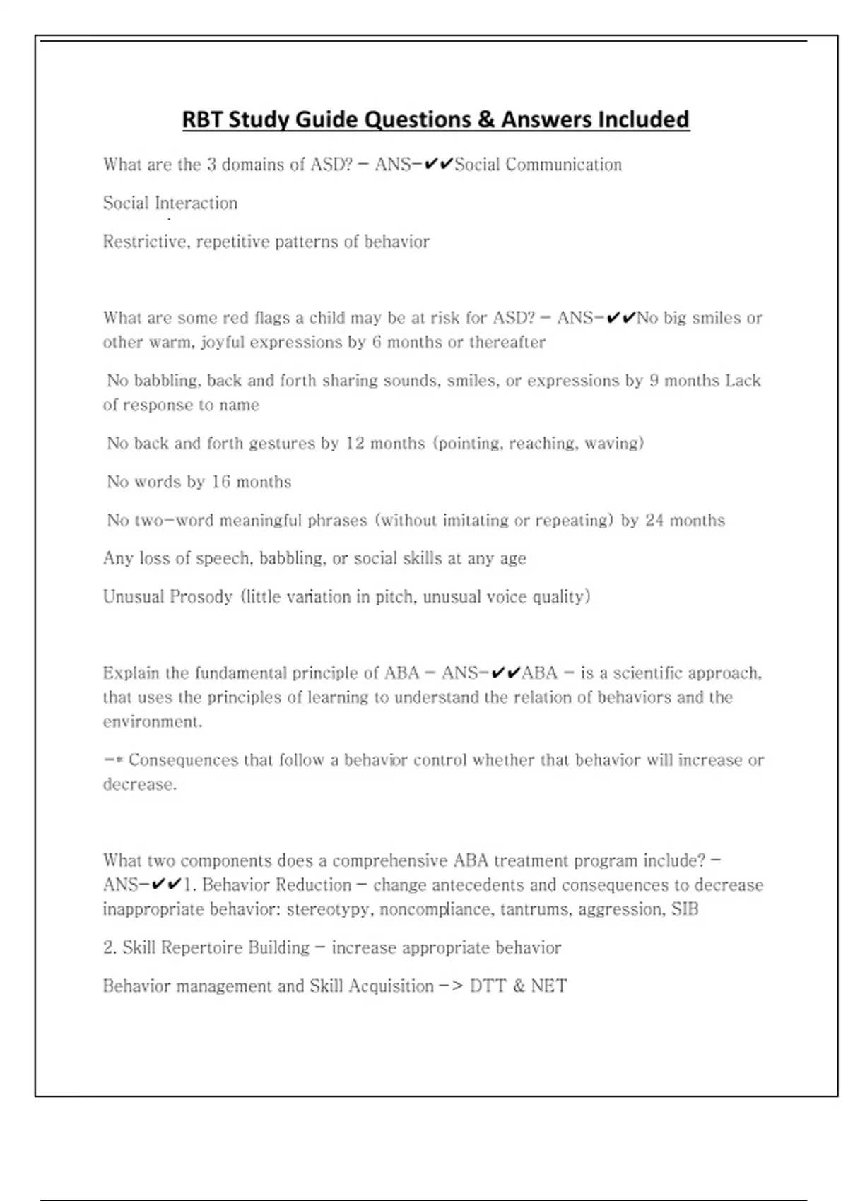 RBT Study Guide Questions & Answers Included What are the 3 domains of ASD? - ANS-Social Communication Social Interaction Restrictive, repetitive patterns of behavior What are some red flags a child may be at risk for ASD? - ANS-No big smiles or other warm, joyful expressions by 6 months or thereafter No babbling, back and forth sharing sounds, smiles, or expressions by 9 months Lack of response to name No back and forth gestures by 12 months (pointing, reaching, waving) No words by 16 months No two-word meaningful phrases (without imitating or repeating) by 24 months Any loss of speech, babbling, or social skills at any age Unusual Prosody (little variation in pitch, unusual voice quality) Explain the fundamental principle of ABA - ANS-ABA - is a scientific approach, that uses the principles of learning to understand the relation of behaviors and the environment. -* Consequences that follow a behavior control whether that behavior will increase or decrease. What two components does a comprehensive ABA treatment program include? - ANS-1. Behavior Reduction - change antecedents and consequences to decrease inappropriate behavior: stereotypy, noncompliance, tantrums, aggression, SIB 2. Skill Repertoire Building - increase appropriate behavior Behavior management and Skill Acquisition -> DTT