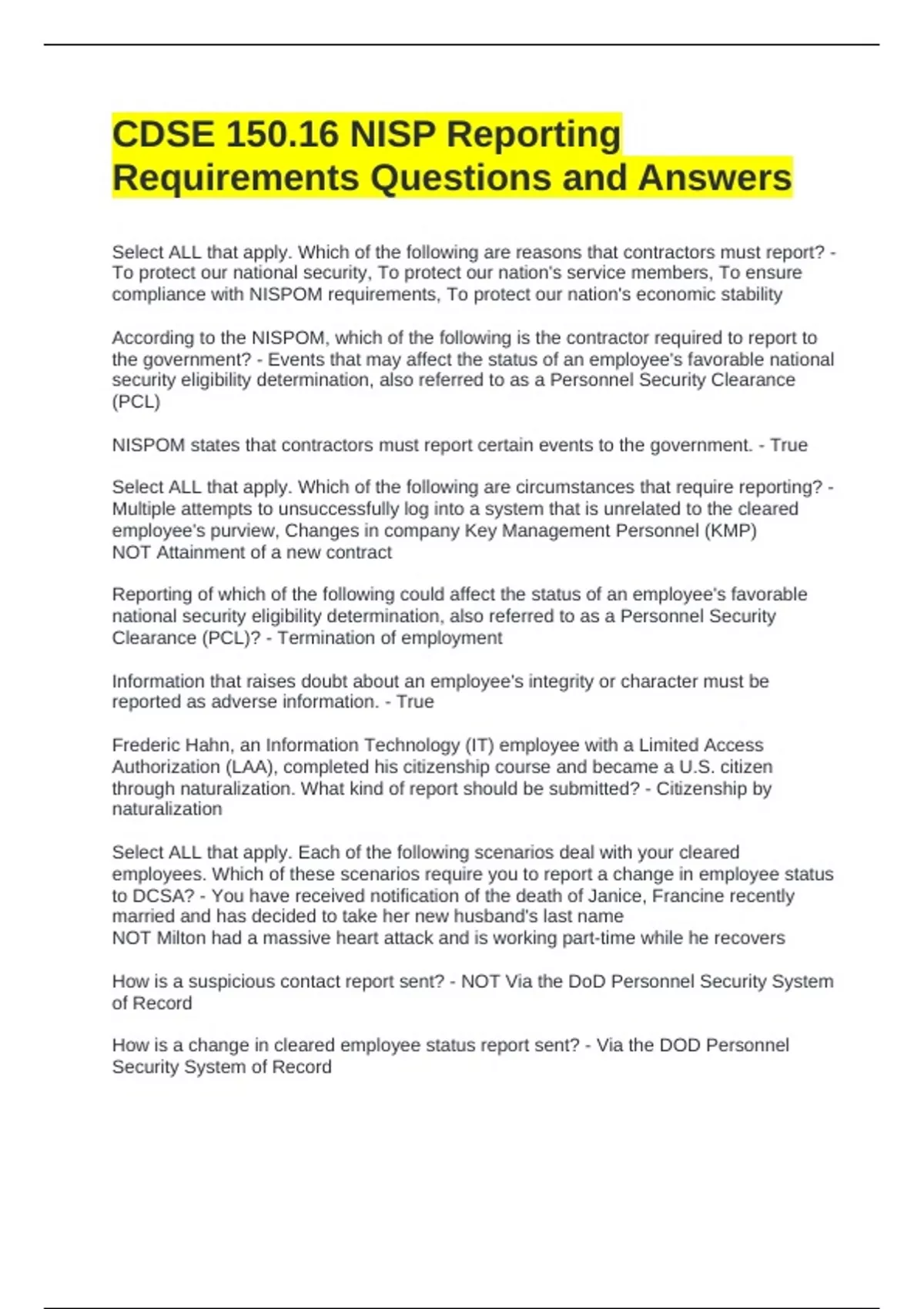 CDSE 150.16 NISP Reporting Requirements Questions and Answers Select ALL that apply. Which of the following are reasons that contractors must report? To protect our national security, To protect our nation's service members, To ensure compliance with NISPOM requirements, To protect our nation's economic stability According to the NISPOM, which of the following is the contractor required to report to the government? Events that may affect the status of an employee's favorable national security eligibility determination, also referred to as a Personnel Security Clearance (PCL) NISPOM states that contractors must report certain events to the government. True Select ALL that apply. Which of the following are circumstances that require reporting? Multiple attempts to unsuccessfully log into a system that is unrelated to the cleared employee's purview, Changes in company Key Management Personnel (KMP) NOT Attainment of a new contract Reporting of which of the following could affect the status of an employee's favorable national security eligibility determination, also referred to as a Personnel Security Clearance (PCL)? Termination of employment Information that raises doubt about an employee's integrity or character must be reported as adverse information. True Frederic Hahn, an Information Technology (IT) employee with a Limited Access Authorization (LAA), completed his citizenship course and became a U.S. citizen through naturalization. What kind of report should be submitted? Citizenship by naturalization Select ALL that apply. Each of the following scenarios deal with your cleared employees. Which of these scenarios require you to report a change in employee status to DCSA? You have received notification of the death of Janice, Francine recently married and has decided to take her new husband's last name NOT Milton had a massive heart attack and is working part-time while he recovers