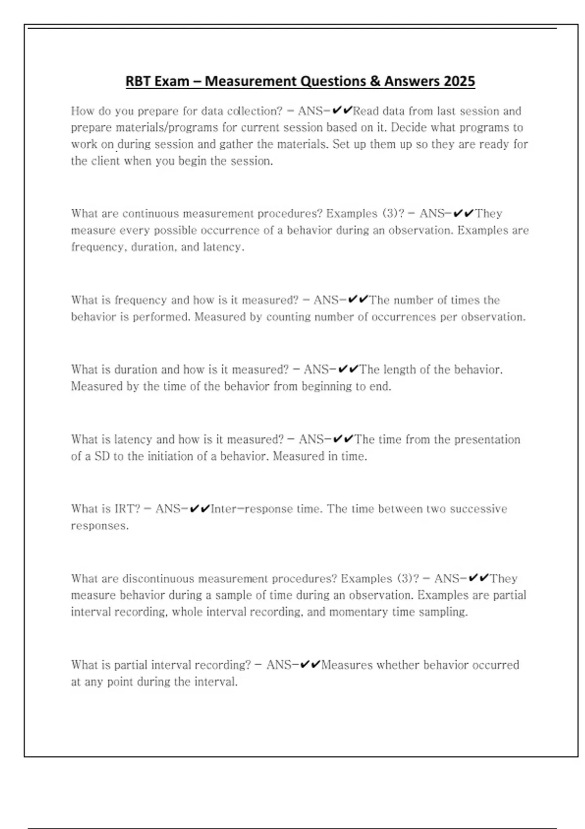 RBT Exam – Measurement Questions & Answers 2025 How do you prepare for data collection? - ANS-Read data from last session and prepare materials/programs for current session based on it. Decide what programs to work on during session and gather the materials. Set up them up so they are ready for the client when you begin the session. What are continuous measurement procedures? Examples (3)? - ANS-They measure every possible occurrence of a behavior during an observation. Examples are frequency, duration, and latency. What is frequency and how is it measured? - ANS-The number of times the behavior is performed. Measured by counting number of occurrences per observation. What is duration and how is it measured? - ANS-The length of the behavior. Measured by the time of the behavior from beginning to end. What is latency and how is it measured? - ANS-The time from the presentation of a SD to the initiation of a behavior. Measured in time. What is IRT? - ANS-Inter-response time. The time between two successive responses. What are discontinuous measurement procedures? Examples (3)? - ANS-They measure behavior during a sample of time during an observation. Examples are partial interval recording, whole interval recording, and momentary time sampling. What is partial interval recording? - ANS-Measures whether behavior occurred at any point during the interval. What is whole interval recording? - ANS-